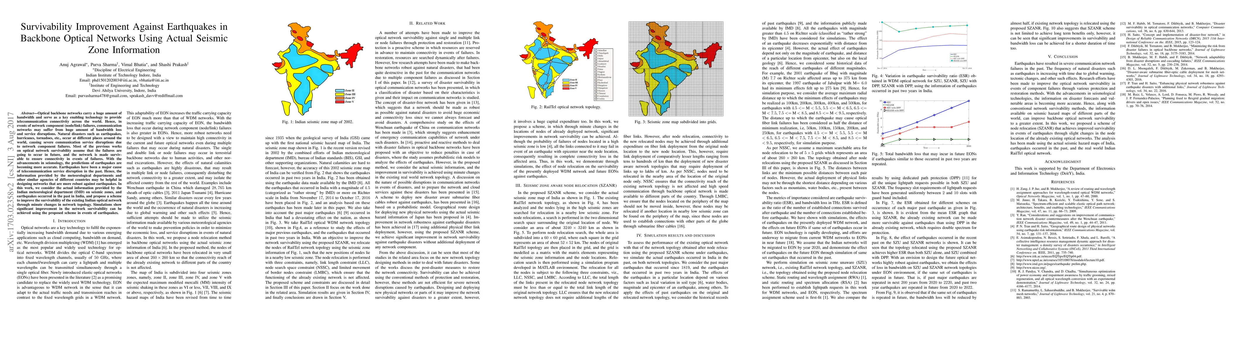 Optical backbone networks carry a huge amount of bandwidth and serve as a key enabling technology to provide telecommunication connectivity across the world. Hence, in events of network component (node/link) failures, communication networks may suffer from huge amount of bandwidth loss and service disruptions. Natural disasters such as earthquakes, hurricanes, tornadoes, etc., occur at different places around the world, causing severe communication service disruptions due to network component failures. Most of the previous works on optical network survivability assume that the failures are going to occur in future, and the network is made survivable to ensure connectivity in events of failures. With the advancements in seismology, the predictions of earthquakes are becoming more accurate. Earthquakes have been a major cause of telecommunication service disruption in the past. Hence, the information provided by the meteorological departments and other similar agencies of different countries may be helpful in designing networks that are more robust against earthquakes. In this work, we consider the actual information provided by the Indian meteorological department (IMD) on seismic zones, and earthquakes occurred in the past in India, and propose a scheme to improve the survivability of the existing Indian optical network through minute changes in network topology. Simulations show significant improvement in the network survivability can be achieved using the proposed scheme in events of earthquakes.