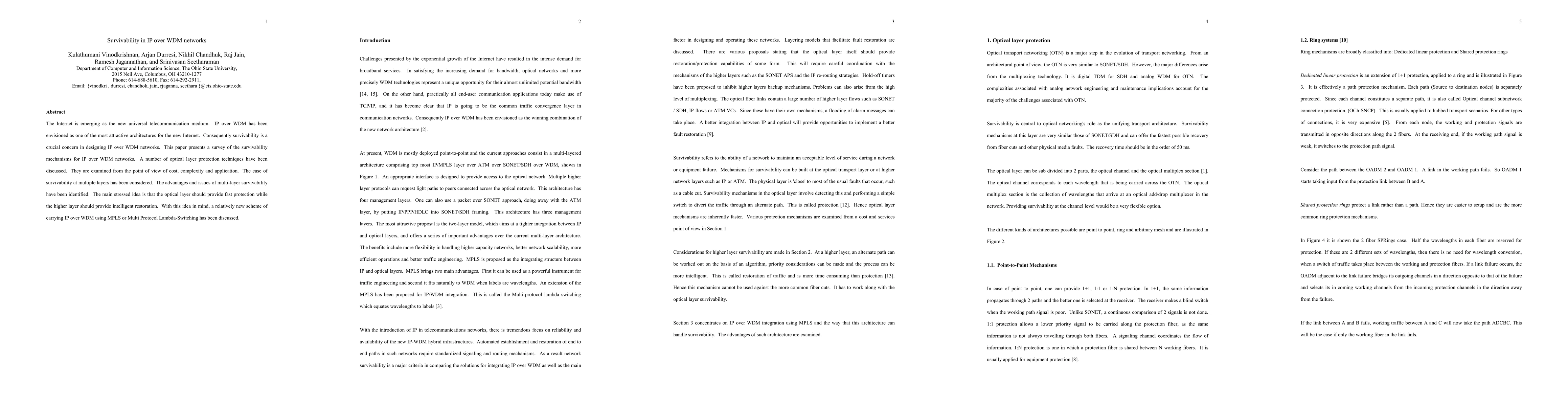 This paper surveys survivability mechanisms in IP over WDM networks, emphasizing optical layer protection techniques and their cost, complexity, and application. It discusses multi-layer survivability, suggesting an architecture where the optical layer provides fast protection while higher layers offer intelligent restoration, facilitated by MPLS signaling.