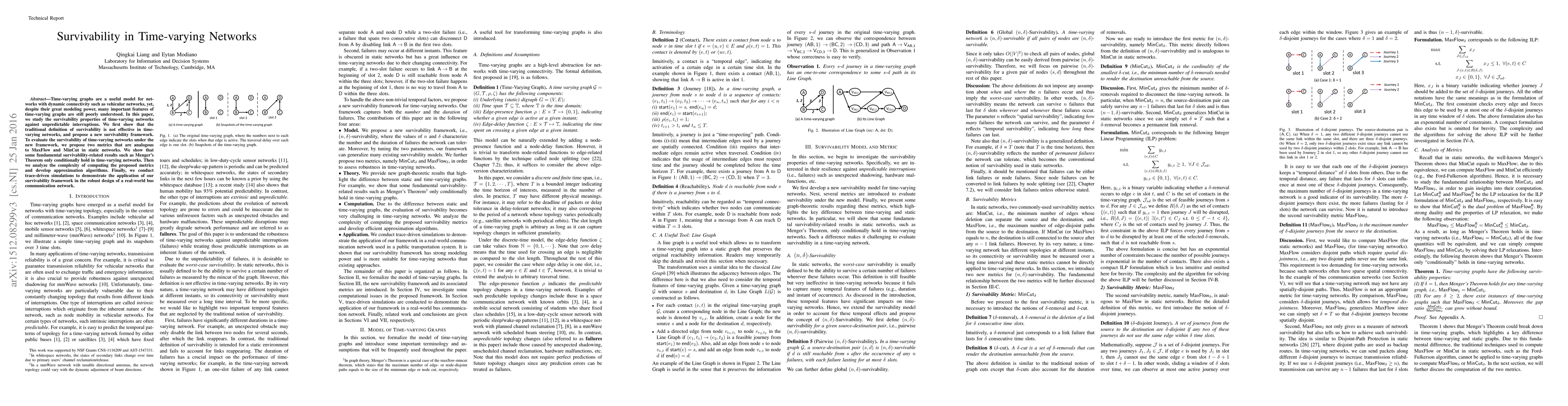 This paper proposes a new framework for survivability in time-varying networks, introducing two metrics analogous to MaxFlow and MinCut for static networks. It demonstrates that traditional survivability definitions are ineffective and develops approximation algorithms for complexity issues, validated through simulations on a bus communication network.