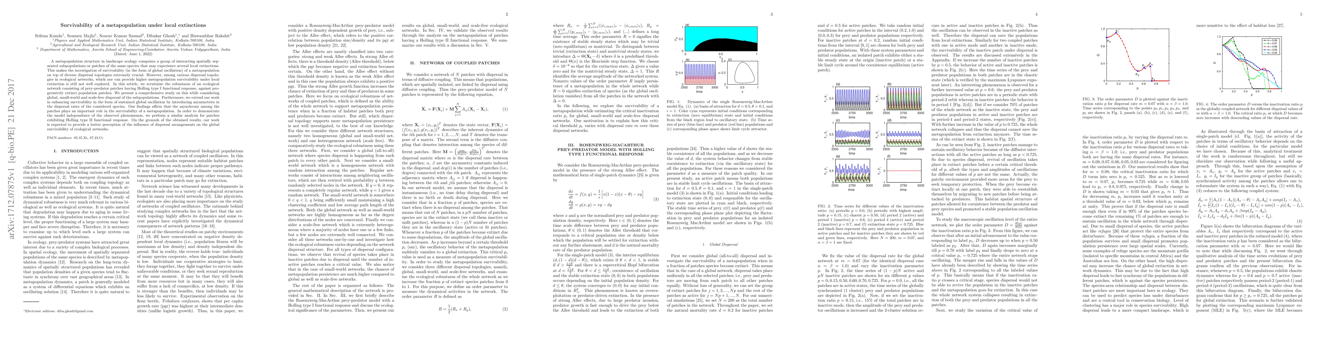 A metapopulation structure in landscape ecology comprises a group of interacting spatially separated subpopulations or patches of the same species that may experience several local extinctions. This makes the investigation of survivability (in the form of global oscillation) of a metapopulation on top of diverse dispersal topologies extremely crucial. However, among various dispersal topologies in ecological networks, which one can provide higher metapopulation survivability under local extinction is still not well explored. In this article, we scrutinize the robustness of an ecological network consisting of prey-predator patches having Holling type I functional response, against progressively extinct population patches. We present a comprehensive study on this while considering global, small-world and scale-free dispersal of the subpopulations. Furthermore, we extend our work in enhancing survivability in the form of sustained global oscillation by introducing asymmetries in the dispersal rates of the considered species. Our findings affirm that the asynchrony among the patches plays an important role in the survivability of a metapopulation. In order to demonstrate the model independence of the observed phenomenon, we perform a similar analysis for patches exhibiting Holling type II functional response. On the grounds of the obtained results, our work is expected to provide a better perception of the influence of dispersal arrangements on the global survivability of ecological networks.