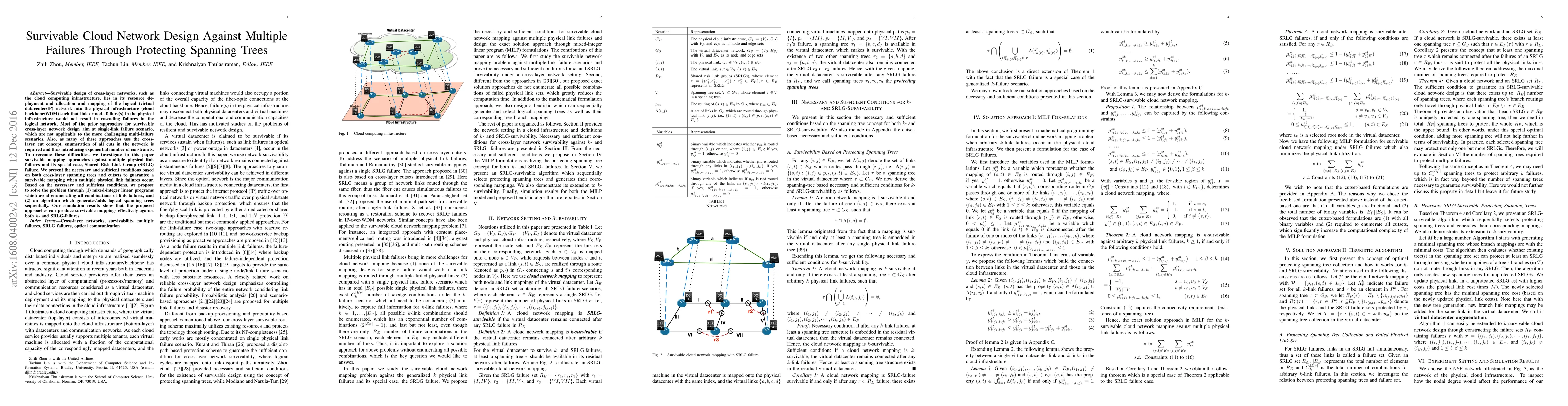 The paper proposes necessary and sufficient conditions for survivable cloud network mapping using spanning trees and cutsets, supported by mixed-integer linear programming (MILP) formulations and a heuristic algorithm. Simulation results demonstrate the effectiveness of the proposed approaches against both k-link and SRLG failures.