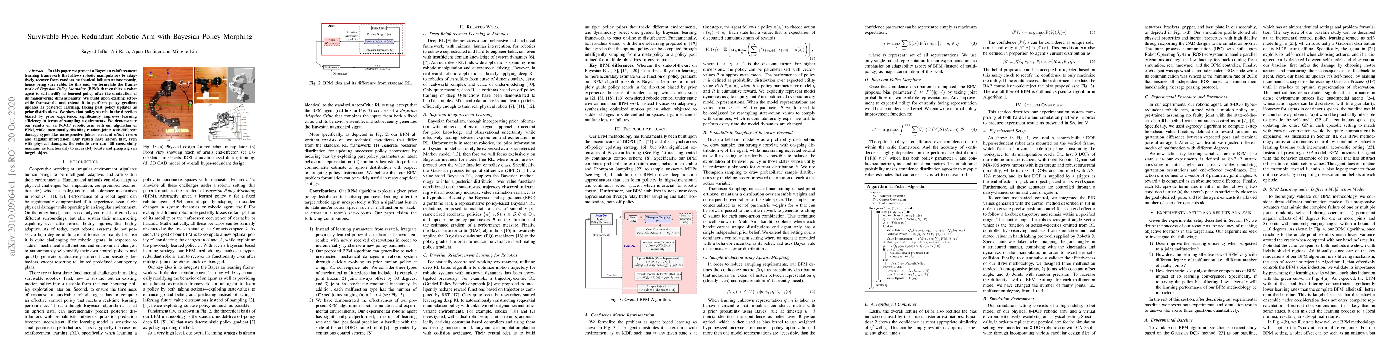The paper presents a Bayesian reinforcement learning framework, Bayesian Policy Morphing (BPM), for robotic manipulators to adaptively recover from random mechanical failures autonomously.