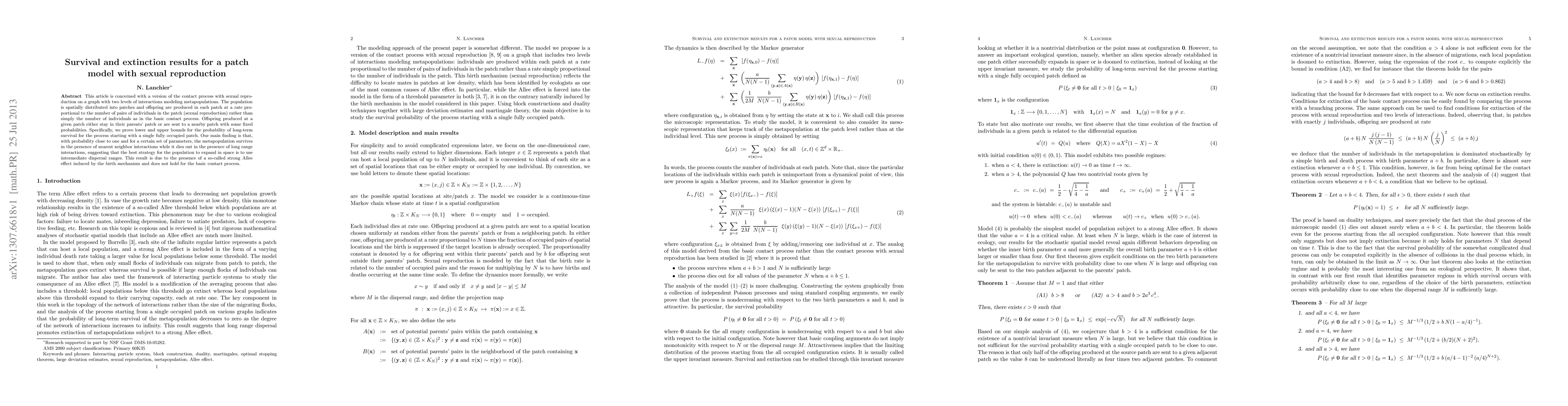 A patch model with sexual reproduction shows that intermediate dispersal ranges can help a population survive in the presence of nearest neighbor interactions, while long-range interactions lead to extinction. The study provides bounds for survival probability and demonstrates the impact of birth mechanics on population dynamics.