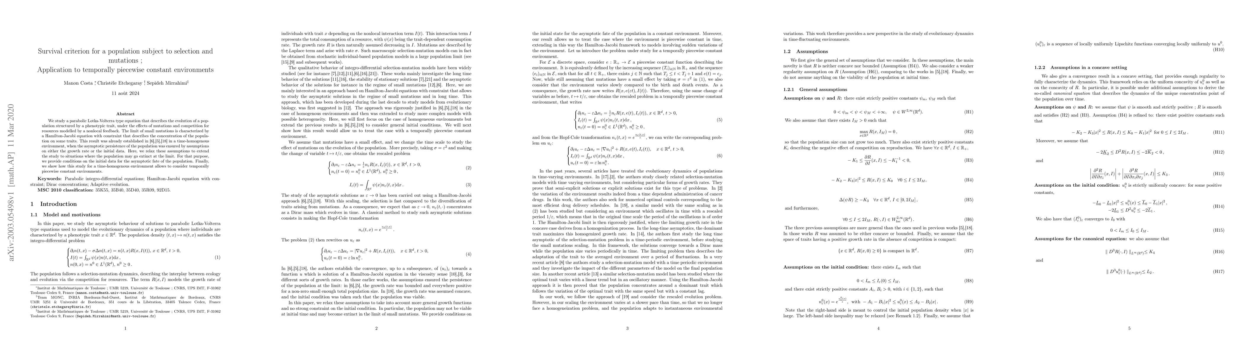 We study a parabolic Lotka-Volterra type equation that describes the evolution of a population structured by a phenotypic trait, under the effects of mutations and competition for resources modelled by a nonlocal feedback. The limit of small mutations is characterized by a Hamilton-Jacobi equation with constraint that describes the concentration of the population on some traits. This result was already established in Barles-Perthame 2008, Barles-Mirrahimi-Perthame 2009, Lorz-Mirrahimi-Perthame 2011 in a time-homogenous environment, when the asymptotic persistence of the population was ensured by assumptions on either the growth rate or the initial data. Here, we relax these assumptions to extend the study to situations where the population may go extinct at the limit. For that purpose, we provide conditions on the initial data for the asymptotic fate of the population. Finally, we show how this study for a time-homogenous environment allows to consider temporally piecewise constant environments.