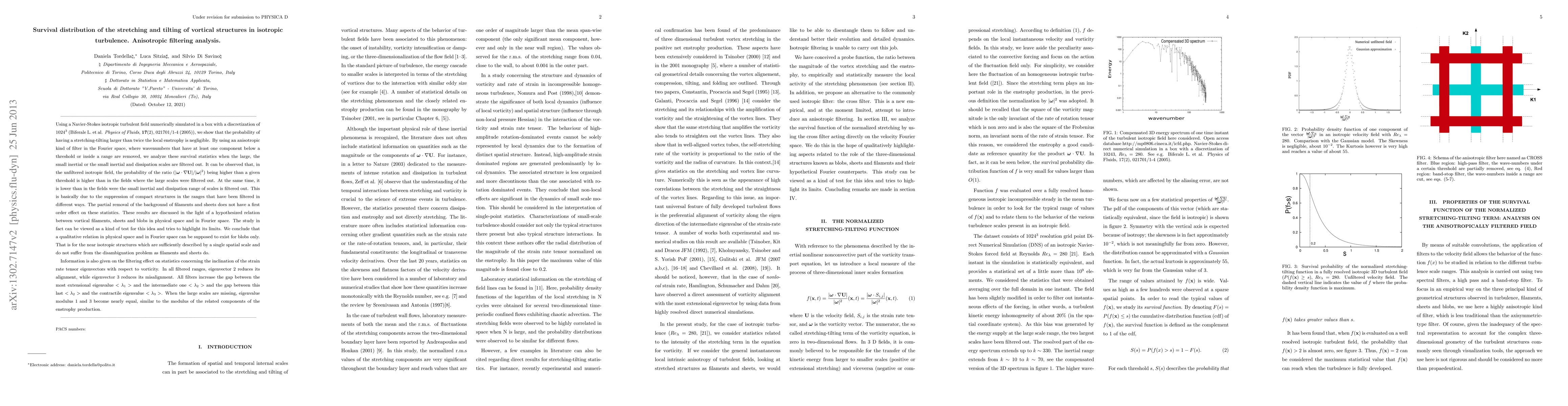 Using a Navier-Stokes isotropic turbulent field numerically simulated (Biferale et al., Phys. Fluids (2005)), we show that the probability of having a stretching-tilting larger than twice the local enstrophy is negligible. By using an anisotropic filter in the Fourier space we analyze these survival statistics when the large, the small inertial or the small inertial and dissipation scales are filtered out. The probability that the ratio (|{\omega} \dot U|/|{\omega}|^2) is higher than a given threshold is higher in the unfiltered isotropic field than in the fields where the large scales were filtered out and is lower than in the fields were the small inertial and dissipative scales are filtered out. This is due to the suppression of compact structures in the removed ranges. The partial removal of the background of filaments and sheets does not have a first order effect on these statistics. These results are discussed in the light of a hypothesized relation between vortical filaments, sheets and blobs. The study can be viewed as a test for this idea and tries to highlight its limits. A qualitative relation in physical space and in Fourier space can be supposed to exist for blobs only. That is for the near isotropic structures which are sufficiently described by a single spatial scale and do not suffer from the disambiguation problem as filaments and sheets do. Information is also given on the filtering effect on the angles between the strain rate tensor eigenvectors and the vorticity: eigenvector 2 reduces its alignment, while eigenvector 3 reduces its misalignment. All filters increase the gap between the most extensional eigenvalue and the intermediate one and the gap between this last and the contractile eigenvalue. When the large scales are missing, eigenvalue modulus 1 and 3 become nearly equal, similar to the modulus of the related components of the enstrophy production.