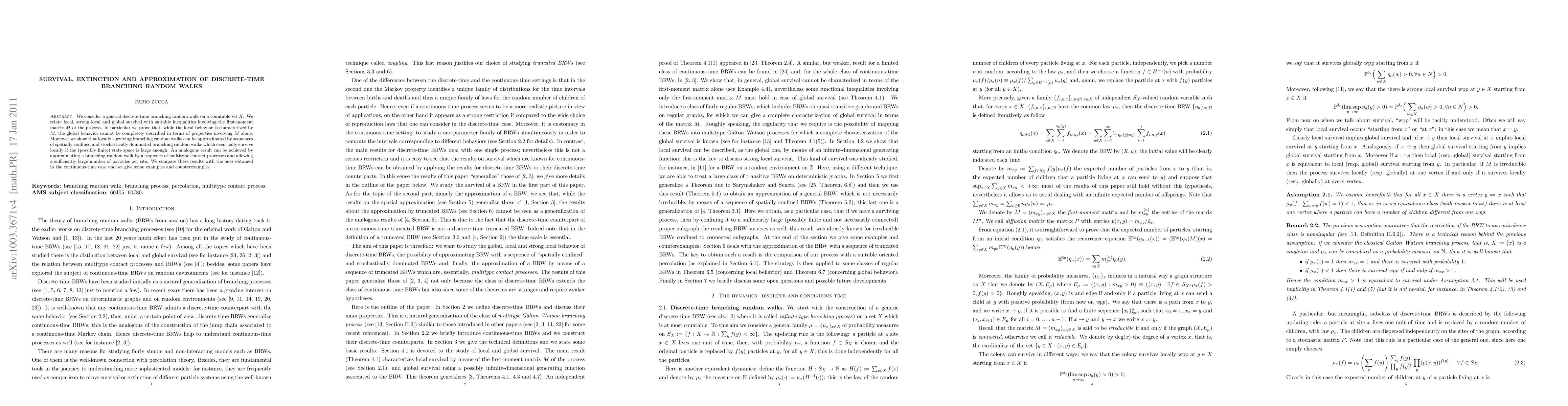 This paper investigates the survival and extinction dynamics of discrete-time branching random walks on countable sets, demonstrating that local and global survival behaviors are influenced by the first-moment matrix M but cannot be fully described by M alone. It also shows that locally surviving walks can be approximated by confined and stochastically dominated sequences, highlighting differences from continuous-time results.