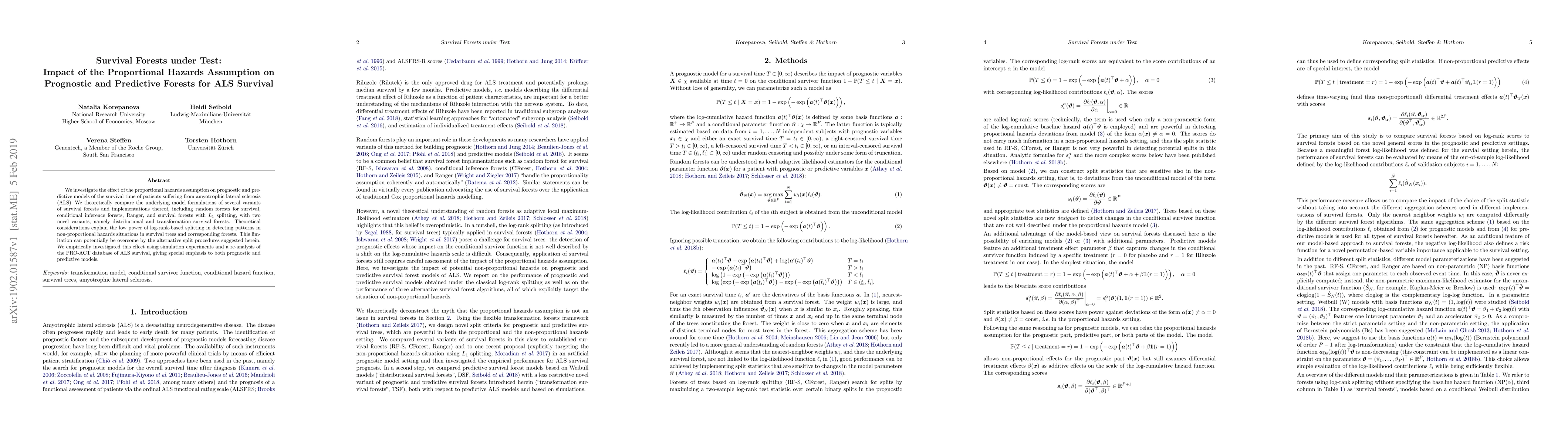 We investigate the effect of the proportional hazards assumption on prognostic and predictive models of the survival time of patients suffering from amyotrophic lateral sclerosis (ALS). We theoretically compare the underlying model formulations of several variants of survival forests and implementations thereof, including random forests for survival, conditional inference forests, Ranger, and survival forests with $L_1$ splitting, with two novel variants, namely distributional and transformation survival forests. Theoretical considerations explain the low power of log-rank-based splitting in detecting patterns in non-proportional hazards situations in survival trees and corresponding forests. This limitation can potentially be overcome by the alternative split procedures suggested herein. We empirically investigated this effect using simulation experiments and a re-analysis of the PRO-ACT database of ALS survival, giving special emphasis to both prognostic and predictive models.