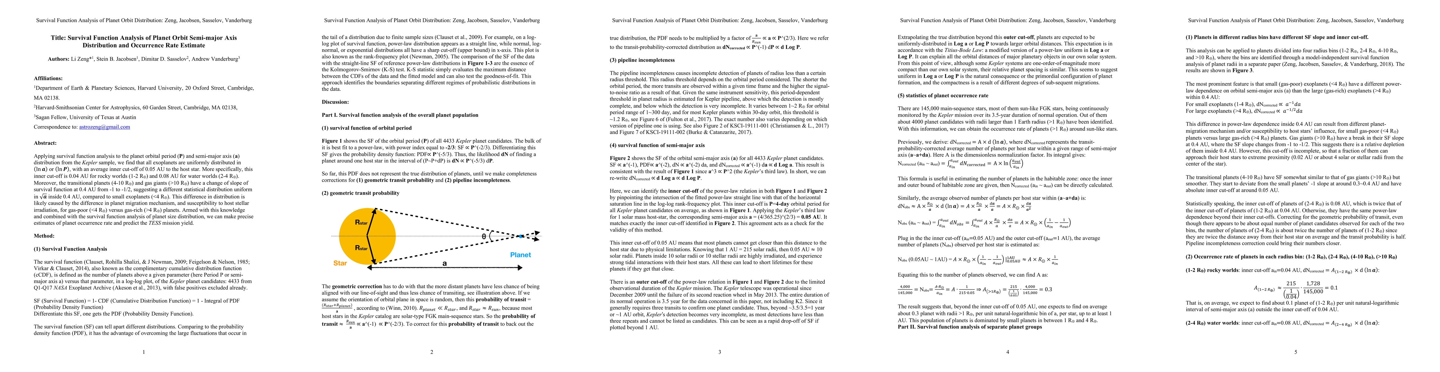 This paper uses survival function analysis to examine the distribution of exoplanets based on orbital period and semi-major axis, revealing uniform distributions with distinct inner cut-offs for different planet types. The study suggests differing migration mechanisms and stellar irradiation effects for gas-poor versus gas-rich planets, aiding in precise estimates of planet occurrence rates and predictions for the TESS mission.