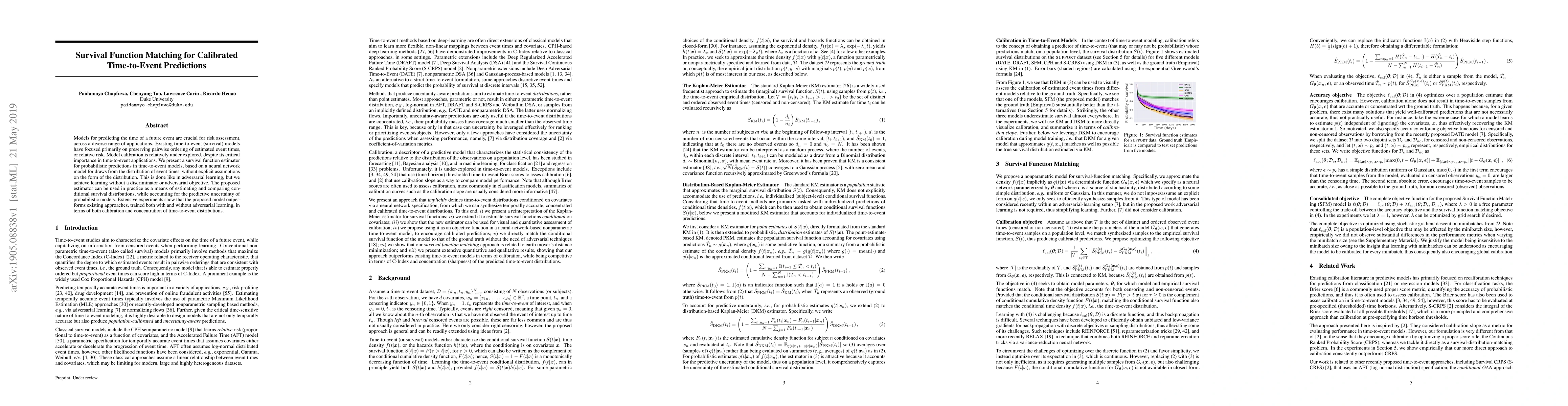 Models for predicting the time of a future event are crucial for risk assessment, across a diverse range of applications. Existing time-to-event (survival) models have focused primarily on preserving pairwise ordering of estimated event times, or relative risk. Model calibration is relatively under explored, despite its critical importance in time-to-event applications. We present a survival function estimator for probabilistic predictions in time-to-event models, based on a neural network model for draws from the distribution of event times, without explicit assumptions on the form of the distribution. This is done like in adversarial learning, but we achieve learning without a discriminator or adversarial objective. The proposed estimator can be used in practice as a means of estimating and comparing conditional survival distributions, while accounting for the predictive uncertainty of probabilistic models. Extensive experiments show that the proposed model outperforms existing approaches, trained both with and without adversarial learning, in terms of both calibration and concentration of time-to-event distributions.