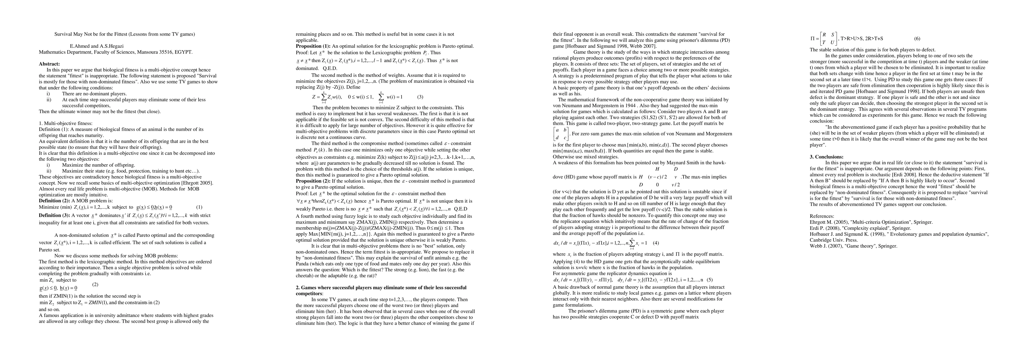In this paper we argue that biological fitness is a multi-objective concept hence the statement "fittest" is inappropriate. The following statement is proposed "Survival is mostly for those with non-dominated fitness". Also we use some TV games to show that under the following conditions: i) There are no dominant players. ii) At each time step successful players may eliminate some of their less successful competitors, Then the ultimate winner may not be the fittest (but close).