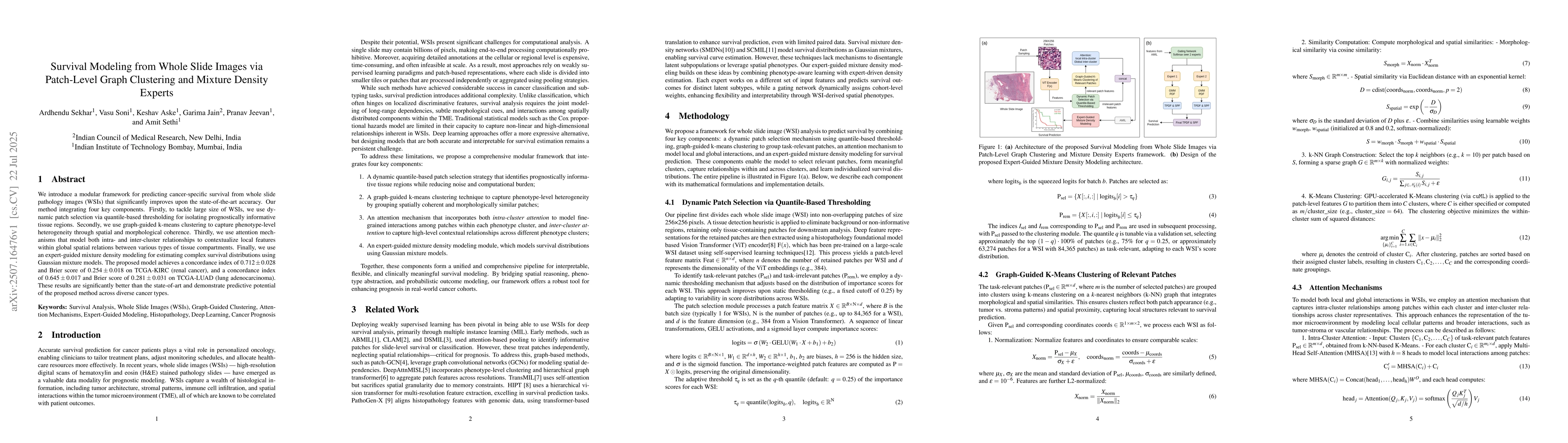 We introduce a modular framework for predicting cancer-specific survival from whole slide pathology images (WSIs) that significantly improves upon the state-of-the-art accuracy. Our method integrating four key components. Firstly, to tackle large size of WSIs, we use dynamic patch selection via quantile-based thresholding for isolating prognostically informative tissue regions. Secondly, we use graph-guided k-means clustering to capture phenotype-level heterogeneity through spatial and morphological coherence. Thirdly, we use attention mechanisms that model both intra- and inter-cluster relationships to contextualize local features within global spatial relations between various types of tissue compartments. Finally, we use an expert-guided mixture density modeling for estimating complex survival distributions using Gaussian mixture models. The proposed model achieves a concordance index of $0.712 \pm 0.028$ and Brier score of $0.254 \pm 0.018$ on TCGA-KIRC (renal cancer), and a concordance index of $0.645 \pm 0.017$ and Brier score of $0.281 \pm 0.031$ on TCGA-LUAD (lung adenocarcinoma). These results are significantly better than the state-of-art and demonstrate predictive potential of the proposed method across diverse cancer types.