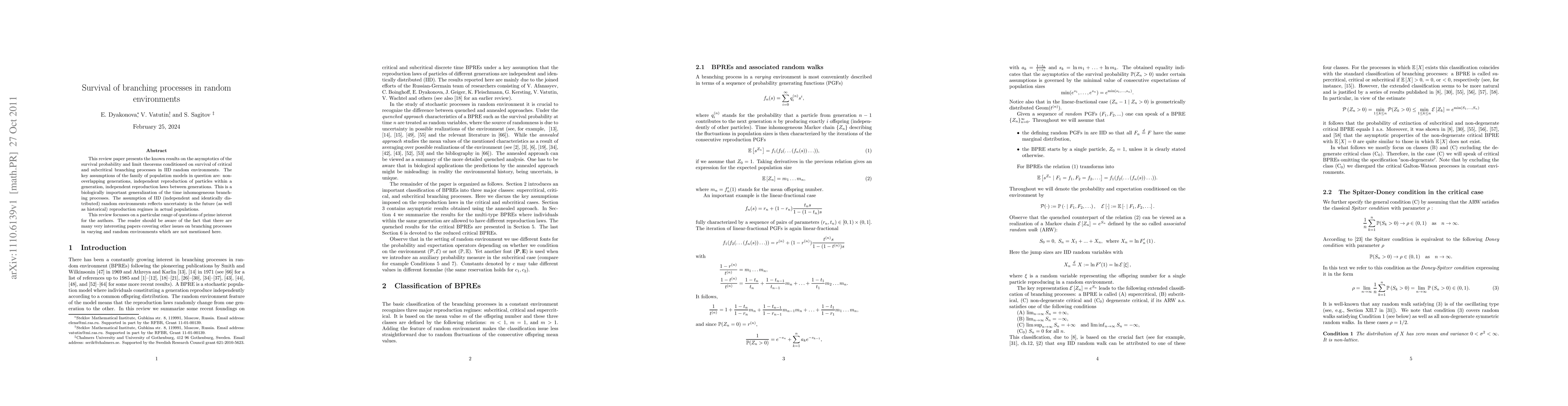 This review paper examines the asymptotic survival probabilities and limit theorems for critical and subcritical branching processes in independent and identically distributed random environments, highlighting the importance of non-overlapping generations and independent reproduction laws. It focuses on biologically relevant models that generalize time inhomogeneous branching processes.