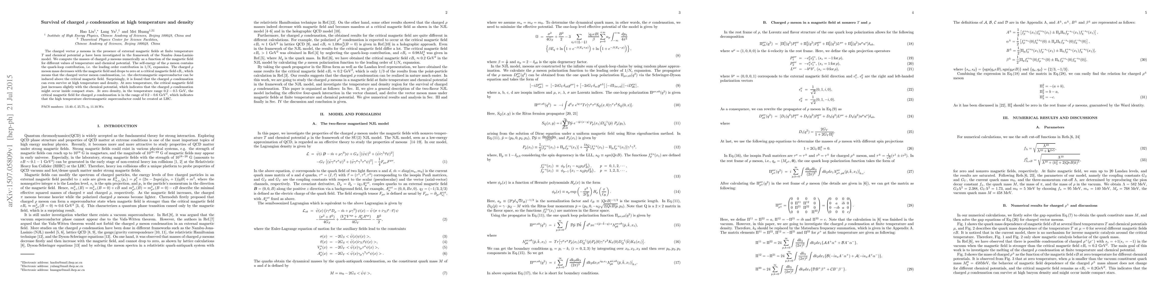 This paper investigates the behavior of charged $\rho$ mesons under magnetic fields at finite temperature and density using the Nambu--Jona-Lasinio model, finding that charged $\rho$ condensation can survive high temperatures and densities, potentially occurring in compact stars and high-temperature electromagnetic superconductors at the LHC.