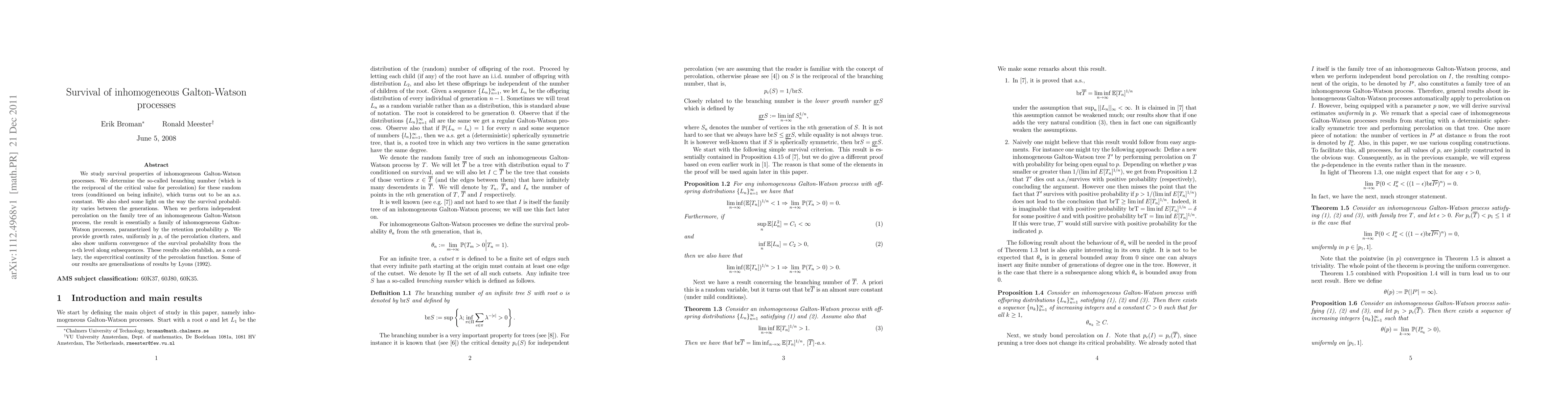 This paper investigates the survival properties of inhomogeneous Galton-Watson processes, determining the branching number for these random trees conditioned on being infinite, and showing it is an almost sure constant. It also examines the variation in survival probability across generations and the effect of independent percolation on these processes, providing growth rates and uniform convergence of survival probabilities.