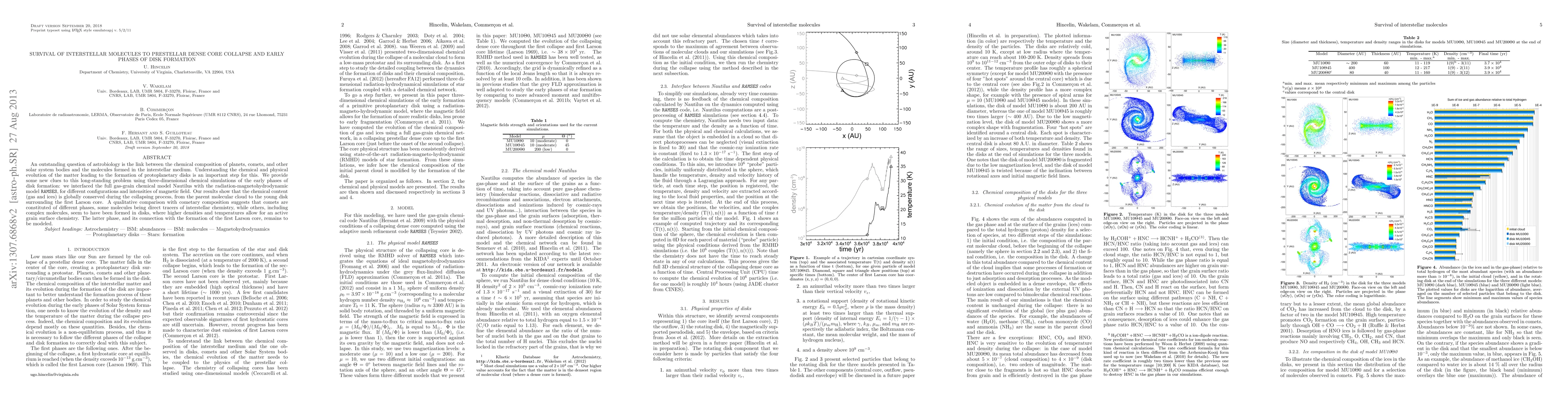 An outstanding question of astrobiology is the link between the chemical composition of planets, comets, and other solar system bodies and the molecules formed in the interstellar medium. Understanding the chemical and physical evolution of the matter leading to the formation of protoplanetary disks is an important step for this. We provide some new clues to this long-standing problem using three-dimensional chemical simulations of the early phases of disk formation: we interfaced the full gas-grain chemical model Nautilus with the radiation-magnetohydrodynamic model RAMSES, for different configurations and intensities of magnetic field. Our results show that the chemical content (gas and ices) is globally conserved during the collapsing process, from the parent molecular cloud to the young disk surrounding the first Larson core. A qualitative comparison with cometary composition suggests that comets are constituted of different phases, some molecules being direct tracers of interstellar chemistry, while others, including complex molecules, seem to have been formed in disks, where higher densities and temperatures allow for an active grain surface chemistry. The latter phase, and its connection with the formation of the first Larson core, remains to be modeled.