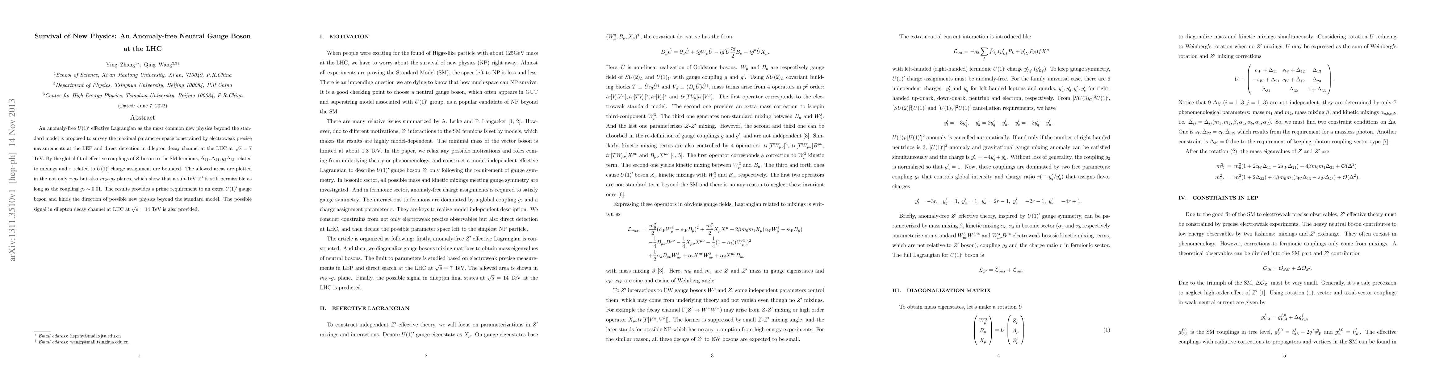 An anomaly-free $U(1)'$ effective Lagrangian as the most common new physics beyond the standard model is proposed to survey the maximal parameter space constrained by electroweak precise measurements at the LEP and direct detection in dilepton decay channel at the LHC at $\sqrt{s}=7$ TeV. By the global fit of effective couplings of $Z$ boson to the SM fermions, $\Delta_{11},\Delta_{21},g_2\Delta_{31}$ related to mixings and $r$ related to $U(1)'$ charge assignment are bounded. The allowed areas are plotted in the not only $r$-$g_2$ but also $m_{Z'}$-$g_2$ planes, which show that a sub-TeV $Z'$ is still permissible as long as the coupling $g_2\sim 0.01$. The results provides a prime requirement to an extra $U(1)'$ gauge boson and hinds the direction of possible new physics beyond the standard model. The possible signal in dilepton decay channel at LHC at $\sqrt{s}=14$ TeV is also provided.