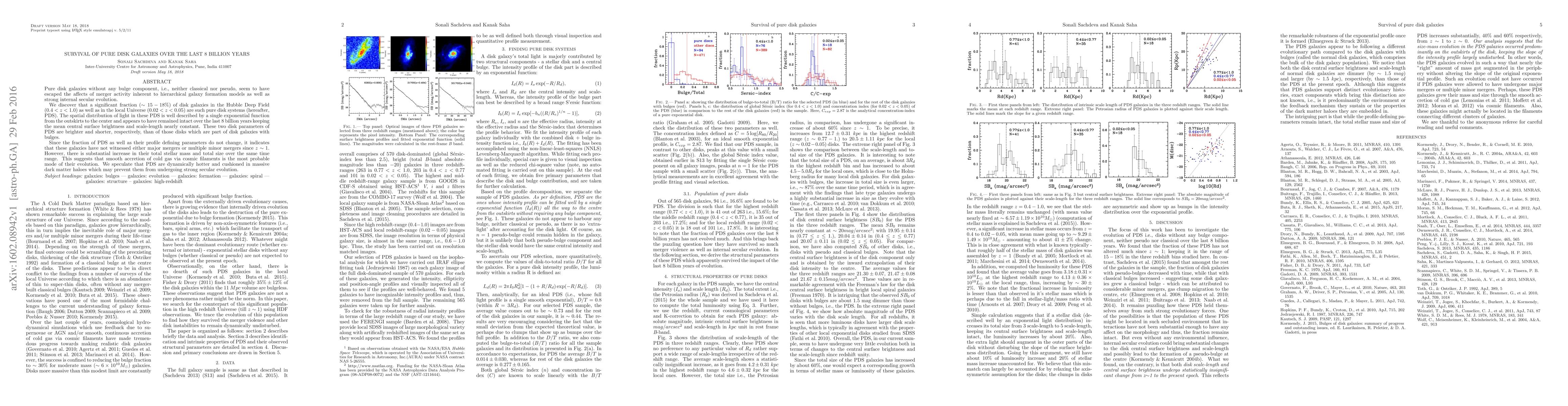 This study finds that pure disk galaxies, lacking bulge components, have survived largely unchanged over the last 8 billion years, with their spatial distribution and key parameters remaining constant. These galaxies have likely evolved primarily through the accretion of cold gas rather than mergers, suggesting they are protected by massive dark matter halos.