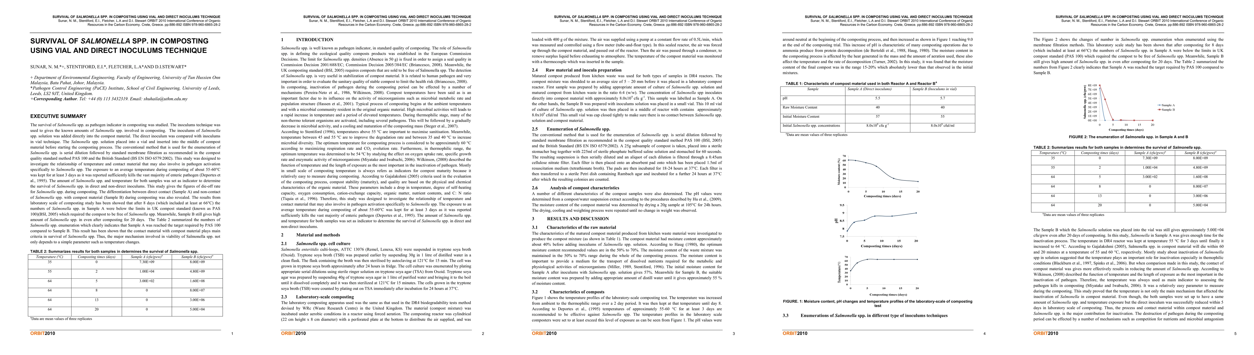 The survival of Salmonella spp. as pathogen indicator in composting was studied. The inoculums technique was used to gives the known amounts of Salmonella spp. involved in composting. The inoculums of Salmonella spp. solution was added directly into the compost material. The direct inoculum was compared with inoculums in vial technique. The Salmonella spp. solution placed into a vial and inserted into the middle of compost material before starting the composting process. The conventional method that is used for the enumeration of Salmonella spp. is serial dilution followed by standard membrane filtration as recommended in the compost quality standard method PAS 100 and the British Standard (BS EN ISO 6579:2002). This study was designed to investigate the relationship of temperature and contact material that may also involve in pathogen activation specifically to Salmonella spp. The exposure to an average temperature during composting of about 55-60{\deg}C was kept for at least 3 days as it was reported sufficiently kills the vast majority of enteric pathogen (Deportes et al., 1995). The amount of Salmonella spp. and temperature for both samples was set as indicator to determine the survival of Salmonella spp. in direct and non-direct inoculums. This study gives the figures of die-off rate for Salmonella spp. during composting. The differentiation between direct contact (Sample A) and non-contact of Salmonella spp. with compost material (Sample B) during composting was also revealed. The results from laboratory scale of composting study has been showed that after 8 days (which included at least at 66{\deg}C) the numbers of Salmonella spp. in Sample A were below the limits in UK compost standard (known as PAS 100)(BSI, 2005) which required the compost to be free of Salmonella spp. Meanwhile, Sample B still gives high amount of Salmonella spp. in even after composting for 20 days.