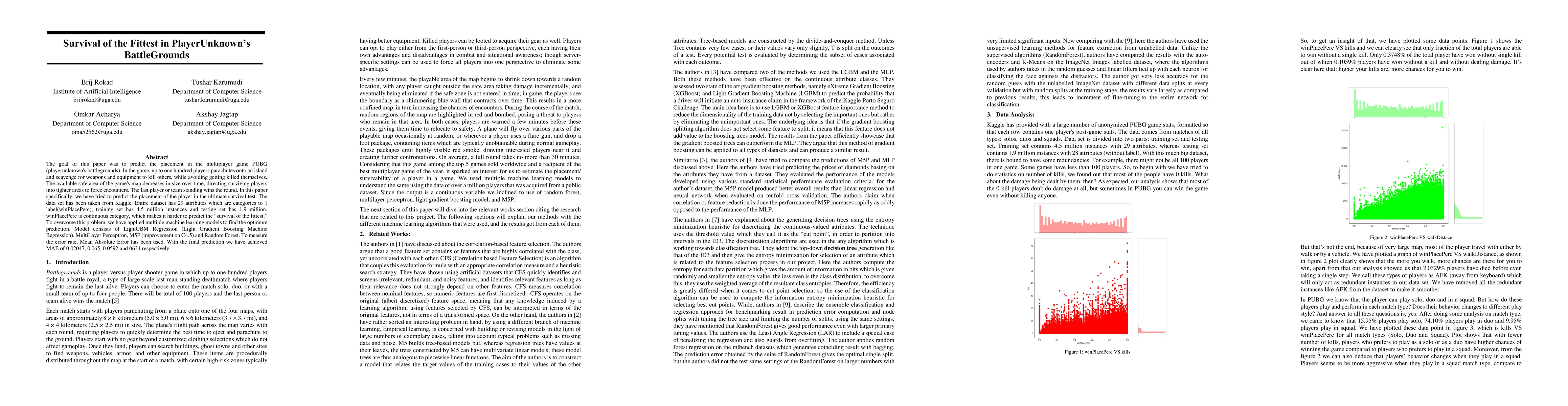 The goal of this paper was to predict the placement in the multiplayer game PUBG (playerunknown battleground). In the game, up to one hundred players parachutes onto an island and scavenge for weapons and equipment to kill others, while avoiding getting killed themselves. The available safe area of the game map decreases in size over time, directing surviving players into tighter areas to force encounters. The last player or team standing wins the round. In this paper specifically, we have tried to predict the placement of the player in the ultimate survival test. The data set has been taken from Kaggle. Entire dataset has 29 attributes which are categories to 1 label(winPlacePerc), training set has 4.5 million instances and testing set has 1.9 million. winPlacePerc is continuous category, which makes it harder to predict the survival of the fittest. To overcome this problem, we have applied multiple machine learning models to find the optimum prediction. Model consists of LightGBM Regression (Light Gradient Boosting Machine Regression), MultiLayer Perceptron, M5P (improvement on C4.5) and Random Forest. To measure the error rate, Mean Absolute Error has been used. With the final prediction we have achieved MAE of 0.02047, 0.065, 0.0592 and 0634 respectively.
