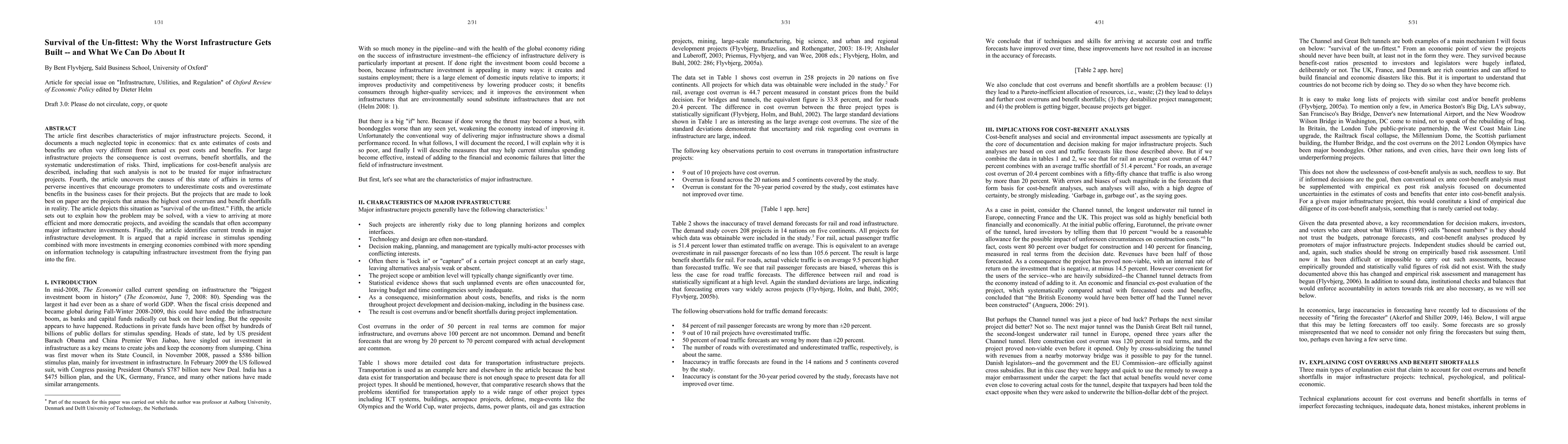 The article first describes characteristics of major infrastructure projects. Second, it documents a much neglected topic in economics: that ex ante estimates of costs and benefits are often very different from actual ex post costs and benefits. For large infrastructure projects the consequence is cost overruns, benefit shortfalls, and the systematic underestimation of risks. Third, implications for cost-benefit analysis are described, including that such analysis is not to be trusted for major infrastructure projects. Fourth, the article uncovers the causes of this state of affairs in terms of perverse incentives that encourage promoters to underestimate costs and overestimate benefits in the business cases for their projects. But the projects that are made to look best on paper are the projects that amass the highest cost overruns and benefit shortfalls in reality. The article depicts this situation as "survival of the un-fittest." Fifth, the article sets out to explain how the problem may be solved, with a view to arriving at more efficient and more democratic projects, and avoiding the scandals that often accompany major infrastructure investments. Finally, the article identifies current trends in major infrastructure development. It is argued that a rapid increase in stimulus spending combined with more investments in emerging economies combined with more spending on information technology is catapulting infrastructure investment from the frying pan into the fire.