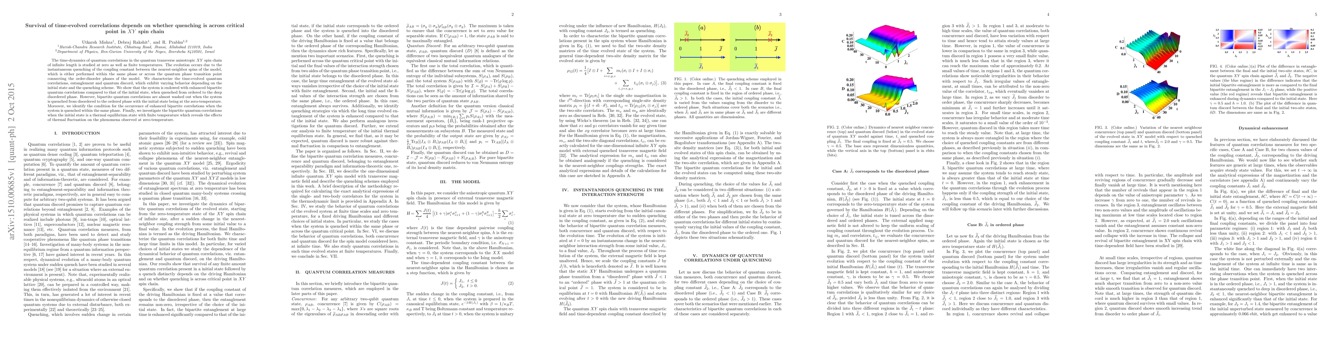 This study investigates the time-evolution of quantum correlations in an XY spin chain after instantaneous quenching across or within its phase transition, revealing enhanced bipartite correlations when quenched from ordered to disordered states but not vice versa. The research also explores the impact of thermal fluctuations on these quantum correlations.