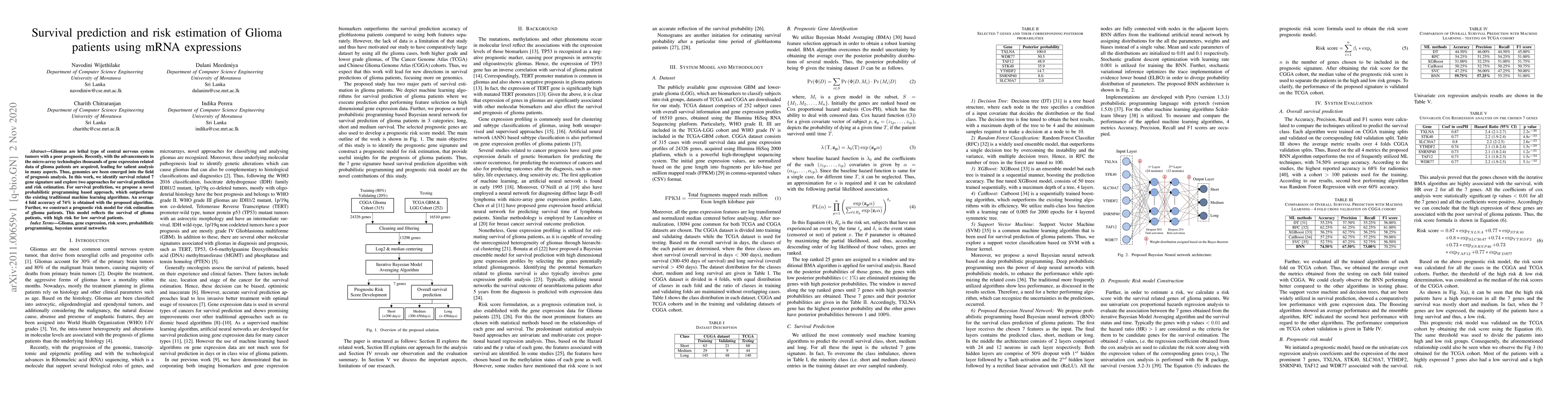This research identifies a 7-gene signature for predicting survival in glioma patients using a novel probabilistic programming approach, achieving a 74% accuracy rate, and constructs a risk model to estimate patient survival, highlighting high-risk patients with lower survival rates.