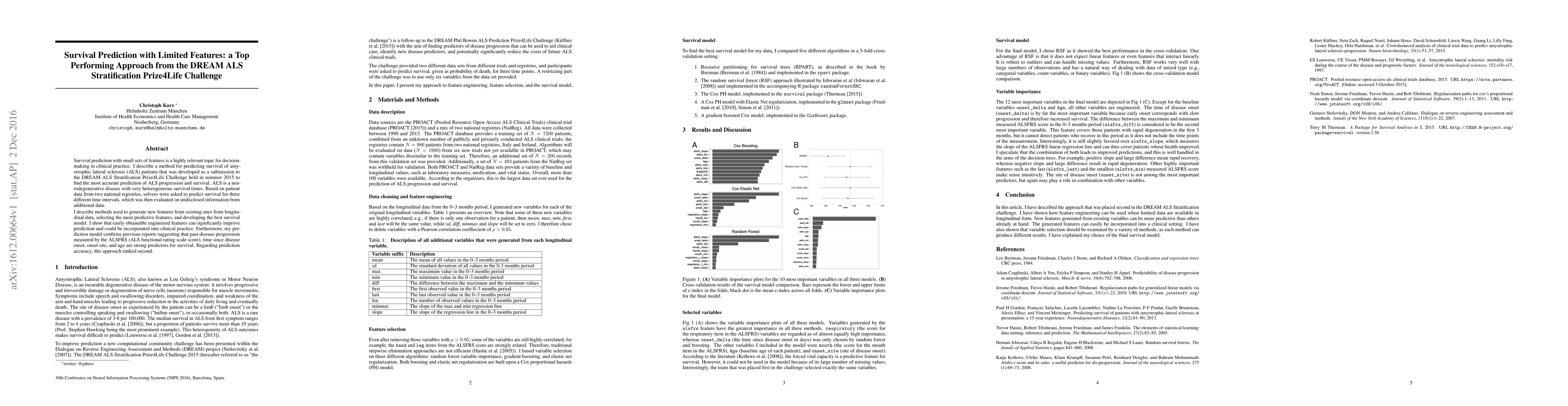 Survival prediction with small sets of features is a highly relevant topic for decision-making in clinical practice. I describe a method for predicting survival of amyotrophic lateral sclerosis (ALS) patients that was developed as a submission to the DREAM ALS Stratification Prize4Life Challenge held in summer 2015 to find the most accurate prediction of ALS progression and survival. ALS is a neurodegenerative disease with very heterogeneous survival times. Based on patient data from two national registries, solvers were asked to predict survival for three different time intervals, which was then evaluated on undisclosed information from additional data. I describe methods used to generate new features from existing ones from longitudinal data, selecting the most predictive features, and developing the best survival model. I show that easily obtainable engineered features can significantly improve prediction and could be incorporated into clinical practice. Furthermore, my prediction model confirms previous reports suggesting that past disease progression measured by the ALSFRS (ALS functional rating scale score), time since disease onset, onset site, and age are strong predictors for survival. Regarding prediction accuracy, this approach ranked second.