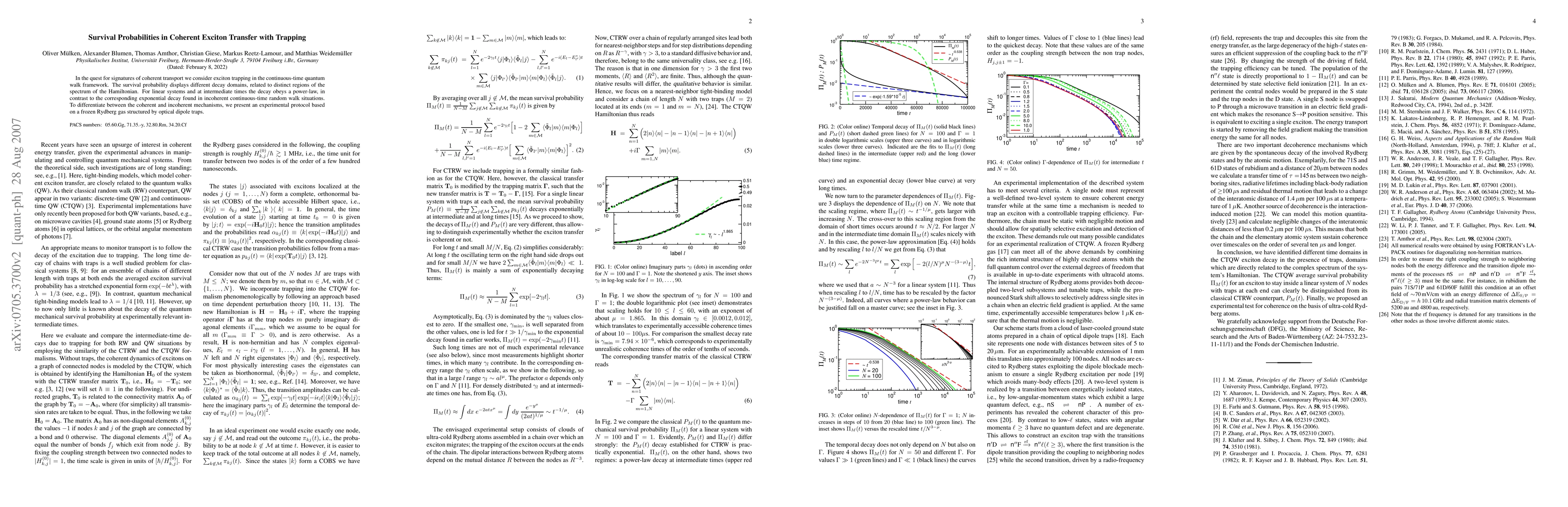 This paper investigates the survival probabilities of coherent exciton transfer in the presence of trapping, revealing distinct decay domains tied to the Hamiltonian's spectrum. Unlike incoherent random walks, coherent transport exhibits power-law decay at intermediate times, and an experimental protocol using a frozen Rydberg gas is proposed to differentiate these mechanisms.