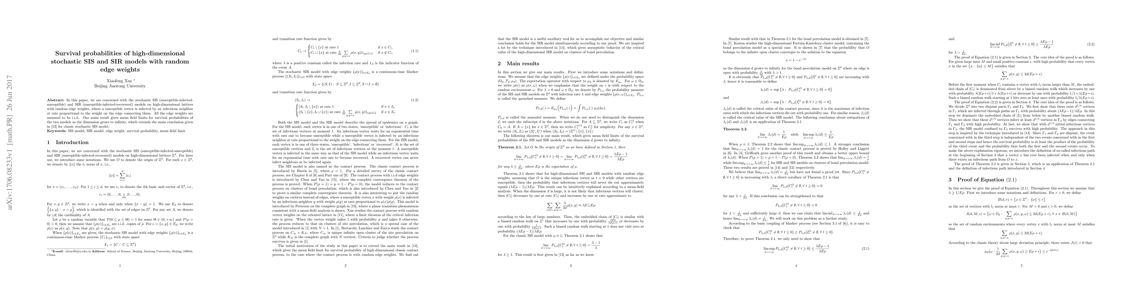 In this paper, we are concerned with the stochastic SIS (susceptible-infected-susceptible) and SIR (susceptible-infected-recovered) models on high-dimensional lattices with random edge weights, where a susceptible vertex is infected by an infectious neighbor at rate proportional to the weight on the edge connecting them. All the edge weights are assumed to be i.i.d.. Our main result gives mean field limits for survival probabilities of the two models as the dimension grows to infinity, which extends the main conclusion given in \cite{Xue2017} for classic stochastic SIS model.