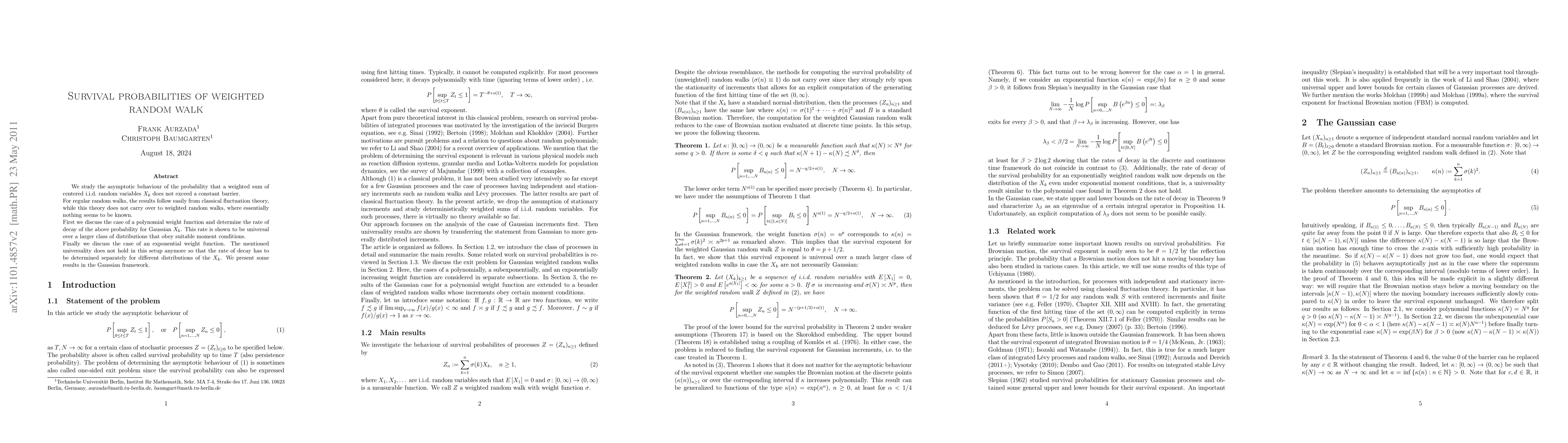 This paper investigates the asymptotic survival probabilities of weighted random walks, where the weights are either polynomial or exponential. For polynomial weights and Gaussian random variables, a universal decay rate is determined, which extends to other distributions with suitable moment conditions. For exponential weights, the universality is lost, necessitating separate decay rate determinations for different distributions.