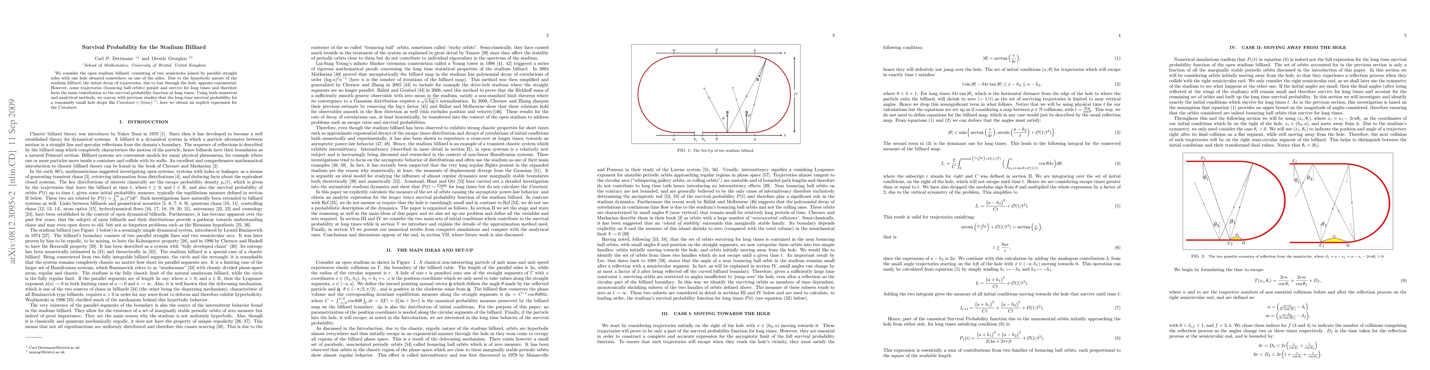 The paper derives an explicit expression for the constant in the long-time decay of the survival probability function for the stadium billiard, confirming previous numerical studies.