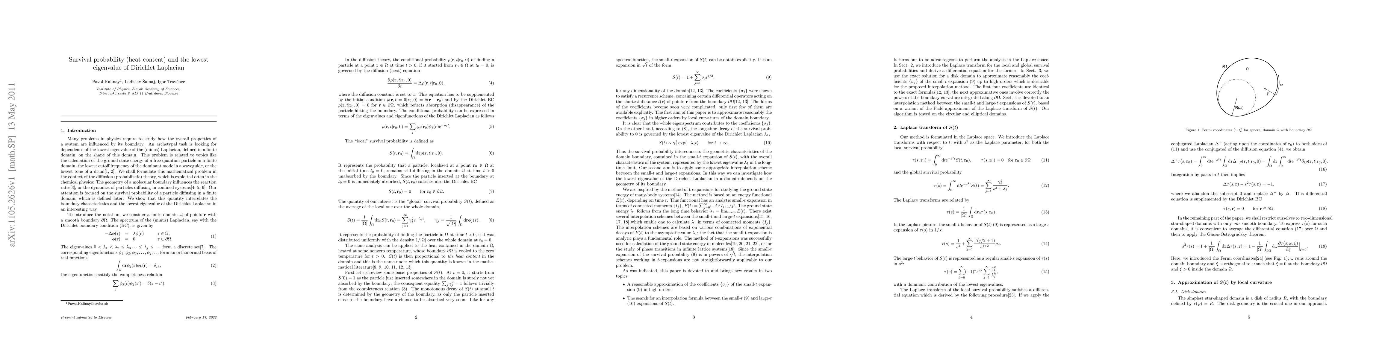 We study the survival probability of a particle diffusing in a two-dimensional domain, bounded by a smooth absorbing boundary. The short-time expansion of this quantity depends on the geometric characteristics of the boundary, whilst its long-time asymptotics is governed by the lowest eigenvalue of the Dirichlet Laplacian defined on the domain. We present a simple algorithm for calculation of the short-time expansion for an arbitrary "star-shaped" domain. The coefficients are expressed in terms of powers of boundary curvature, integrated around the circumference of the domain. Based on this expansion, we look for a Pad\'e interpolation between the short-time and the long-time behavior of the survival probability, i.e. between geometric characteristics of the boundary and the lowest eigenvalue of the Dirichlet Laplacian.