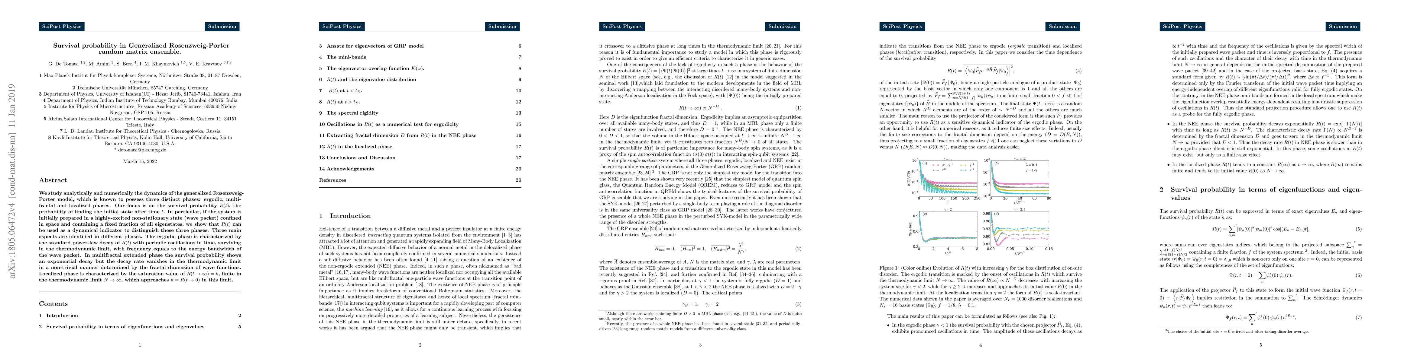 The generalized Rosenzweig-Porter model exhibits distinct phases with varying survival probabilities after time t, characterized by power-law or exponential decay in the ergodic and multifractal phases, respectively, and a saturation value in the localized phase.