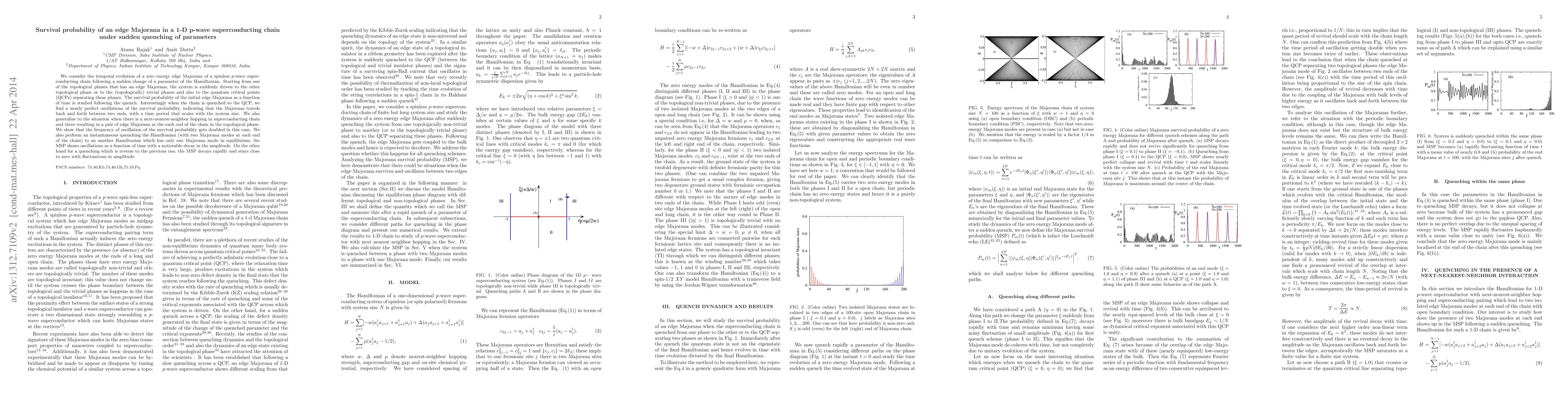 This research investigates the survival probability of edge Majorana fermions in a 1-D p-wave superconducting chain under sudden parameter changes. The study finds nearly perfect oscillations of survival probability when quenched to quantum critical points, indicating Majorana back-and-forth travel. It also explores scenarios with next-nearest-neighbor hopping, doubling the oscillation frequency, and shows differing decay rates for forward and reverse quenches between different equilibrium states.
