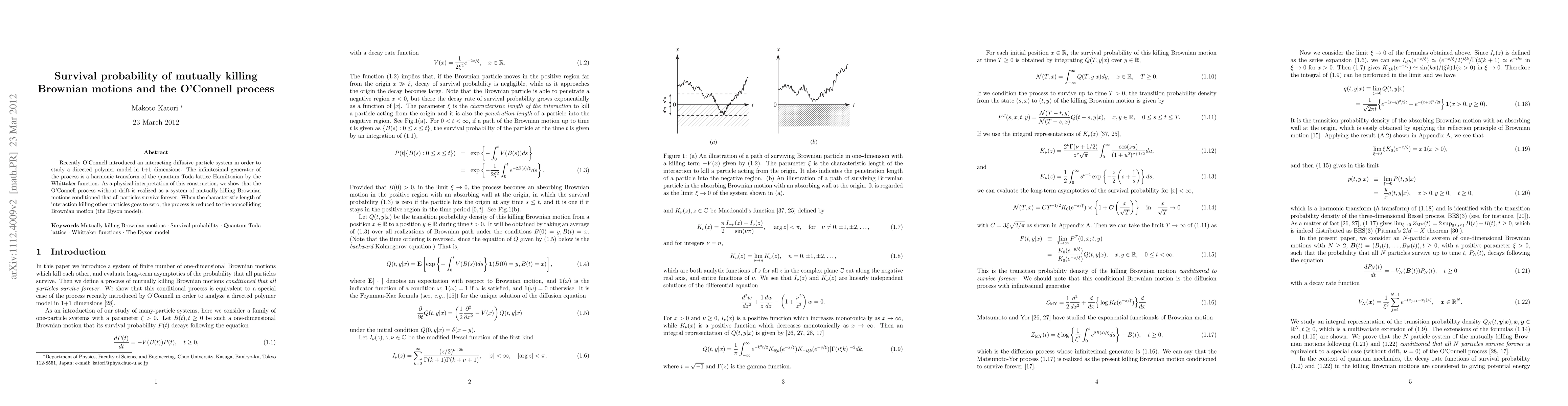 Recently O'Connell introduced an interacting diffusive particle system in order to study a directed polymer model in 1+1 dimensions. The infinitesimal generator of the process is a harmonic transform of the quantum Toda-lattice Hamiltonian by the Whittaker function. As a physical interpretation of this construction, we show that the O'Connell process without drift is realized as a system of mutually killing Brownian motions conditioned that all particles survive forever. When the characteristic length of interaction killing other particles goes to zero, the process is reduced to the noncolliding Brownian motion (the Dyson model).