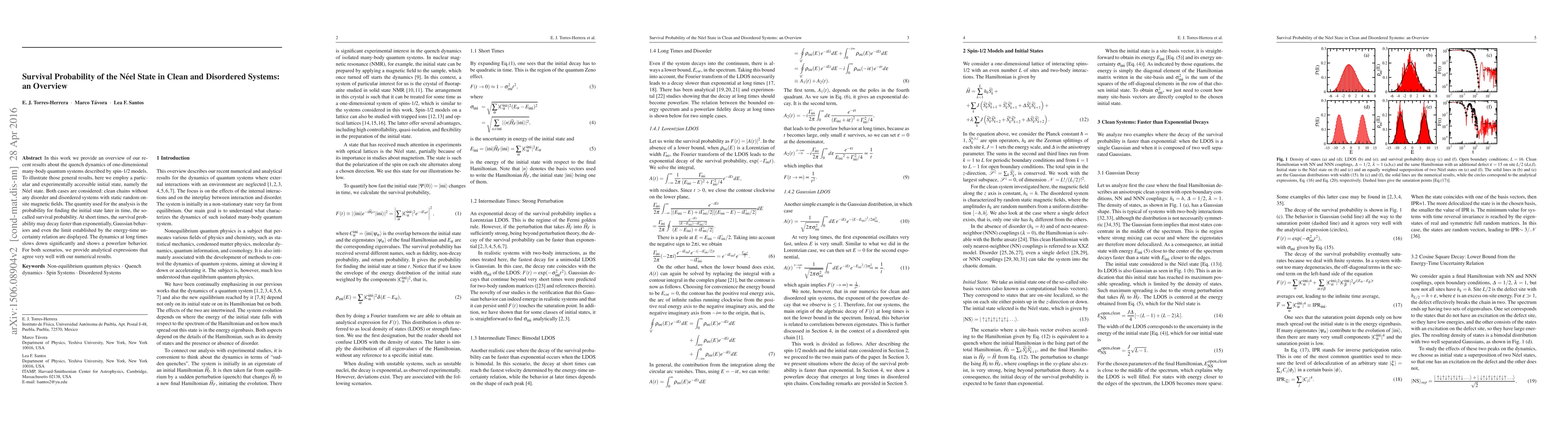 This paper reviews the dynamics of one-dimensional quantum spin-1/2 systems, focusing on the survival probability of the N\'eel state in both clean and disordered systems. Analytical expressions are provided that match numerical results, showing that the survival probability exhibits non-exponential decay at short times and powerlaw behavior at long times.