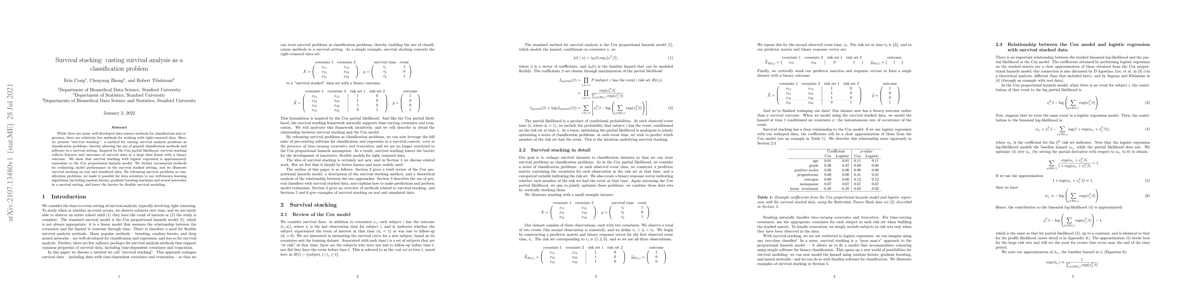 "Survival stacking" transforms survival analysis into a classification problem, enabling the application of general classification methods. This approach approximates the Cox proportional hazards model and facilitates the use of advanced learning algorithms like random forests and neural networks in survival analysis.