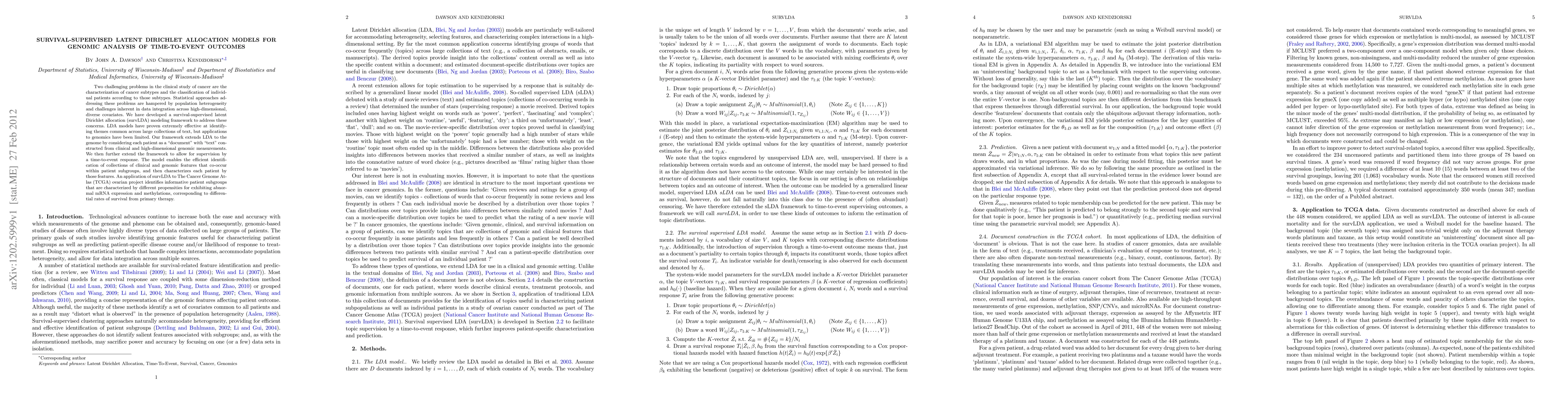 This paper introduces a survival-supervised latent Dirichlet allocation (survLDA) model for genomic analysis of time-to-event outcomes, enabling the identification of cancer subtypes and patient classification based on integrated clinical and genomic data. The model characterizes patient subgroups by co-occurring clinical and genomic features, demonstrating its utility in analyzing TCGA ovarian cancer data.