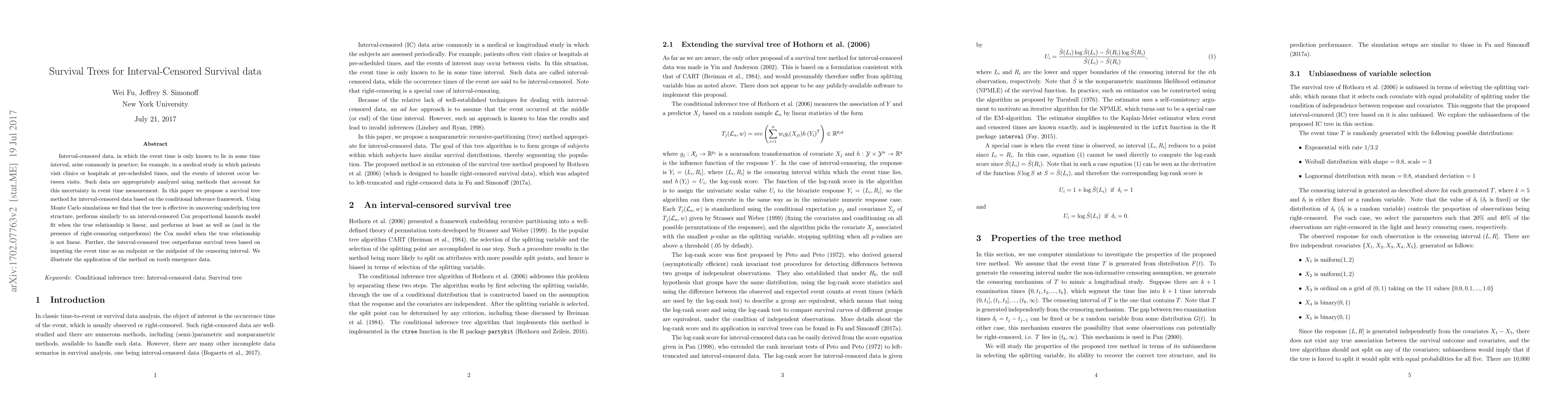 This paper proposes a survival tree method for analyzing interval-censored survival data, demonstrating its effectiveness through simulations and comparisons to Cox models. The proposed method outperforms traditional Cox models and other survival trees when the true relationship is non-linear.
