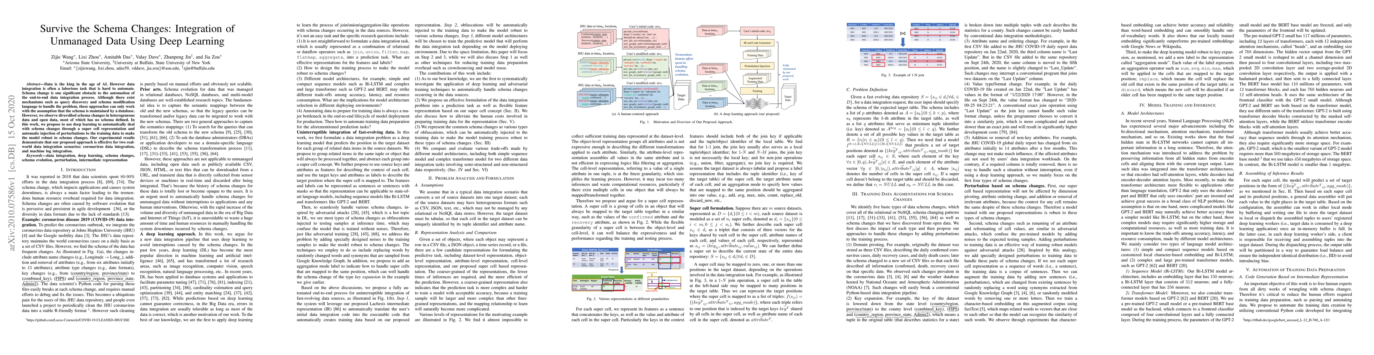 This paper proposes a deep learning approach to automate data integration in the face of schema changes, using super cell representation and automatic data perturbation. Experimental results show effectiveness in integrating coronavirus data and machine logs.