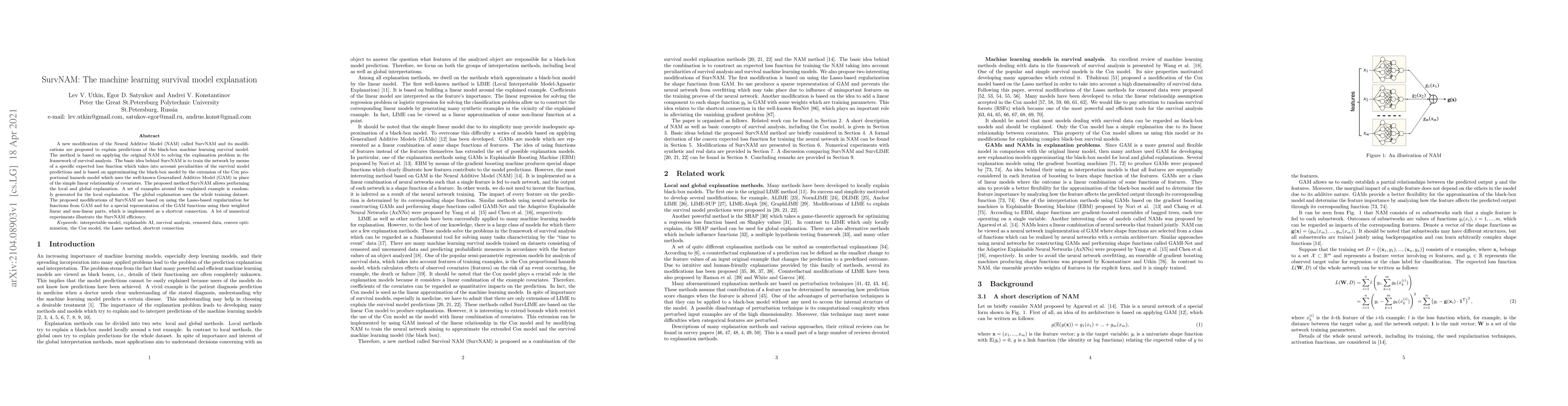 A new modification of the Neural Additive Model (NAM) called SurvNAM and its modifications are proposed to explain predictions of the black-box machine learning survival model. The method is based on applying the original NAM to solving the explanation problem in the framework of survival analysis. The basic idea behind SurvNAM is to train the network by means of a specific expected loss function which takes into account peculiarities of the survival model predictions and is based on approximating the black-box model by the extension of the Cox proportional hazards model which uses the well-known Generalized Additive Model (GAM) in place of the simple linear relationship of covariates. The proposed method SurvNAM allows performing the local and global explanation. A set of examples around the explained example is randomly generated for the local explanation. The global explanation uses the whole training dataset. The proposed modifications of SurvNAM are based on using the Lasso-based regularization for functions from GAM and for a special representation of the GAM functions using their weighted linear and non-linear parts, which is implemented as a shortcut connection. A lot of numerical experiments illustrate the SurvNAM efficiency.