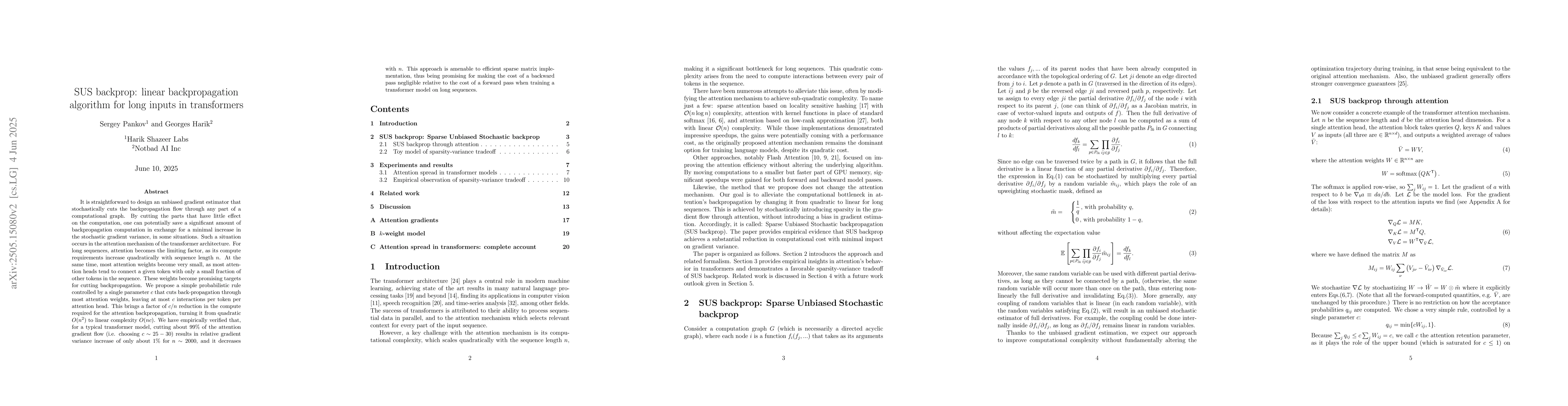 The introduction of SUS backprop, a linear backpropagation algorithm for transformers that cuts backpropagation through most attention weights, reducing computational complexity from quadratic to linear in sequence length.