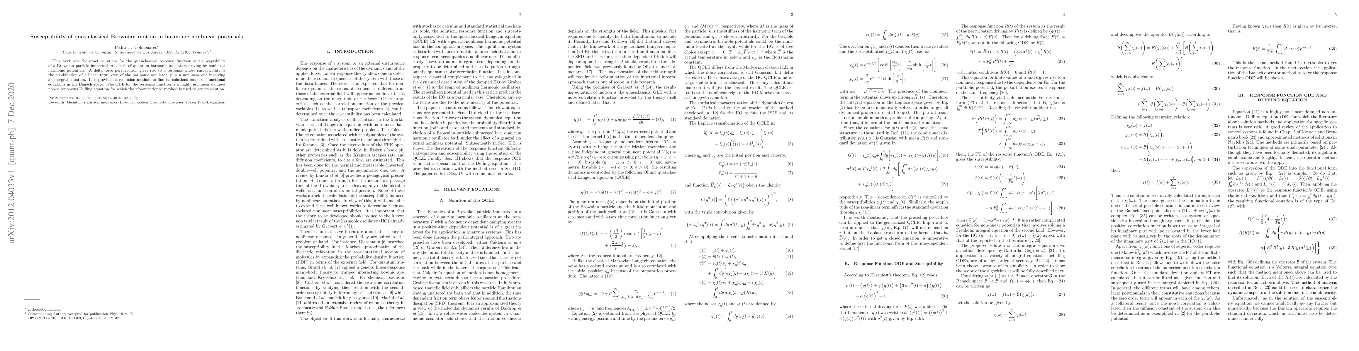 This work sets the exact equations for the quasiclassical response function and susceptibility of a Brownian particle immersed in a bath of quantum harmonic oscillators driving by nonlinear harmonic potentials. A delta force perturbation gives rise to a response whose susceptibility is the combination of a linear term, own of the harmonic oscillator, plus a nonlinear one involving an integral \textcolor{black}{equation. It is provided a recursion method to find its solutions based on functional equations in the Banach space.} The ODE for the response function is a highly nonlinear damped non-autonomous Duffing equation for which the aforementioned method is used to get its solution.