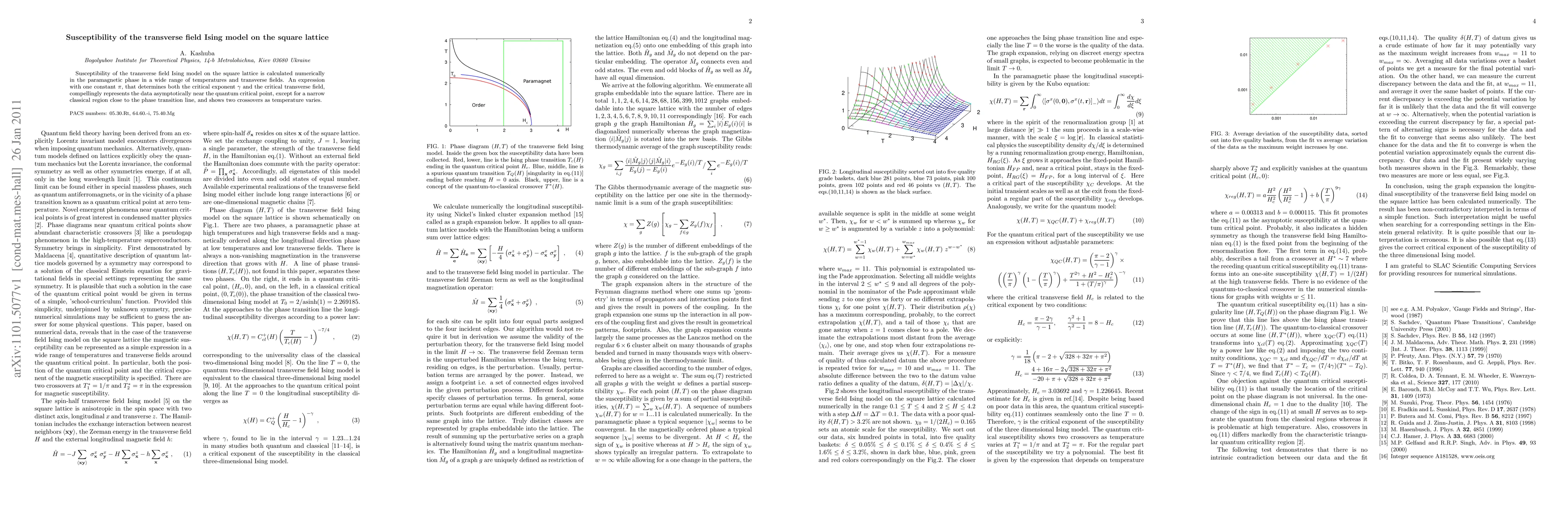 This paper numerically investigates the susceptibility of the transverse field Ising model on the square lattice, revealing a single constant $\pi$ that determines both the critical exponent $\gamma$ and the critical transverse field, with two crossovers observed as temperature changes. The findings show this constant's effectiveness near the quantum critical point, except in a narrow classical region.