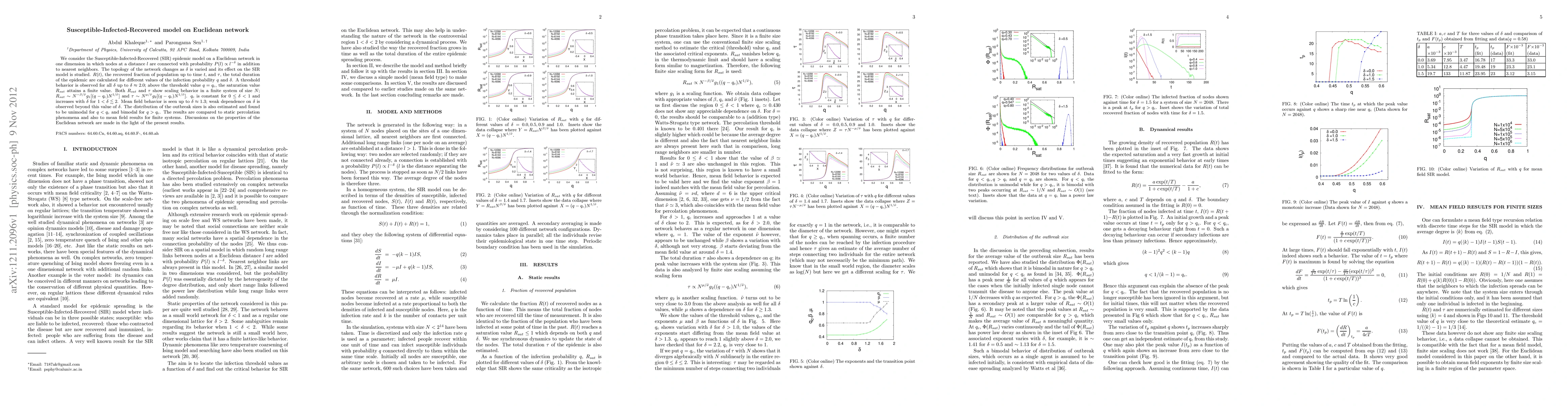 This paper studies the Susceptible-Infected-Recovered (SIR) epidemic model on a one-dimensional Euclidean network, where nodes are connected based on distance. It finds a threshold behavior in the infection dynamics, with a finite saturation value of recovered individuals above a critical infection probability. The study also reveals scaling behavior in outbreak sizes and compares results to static percolation and mean field theories.
