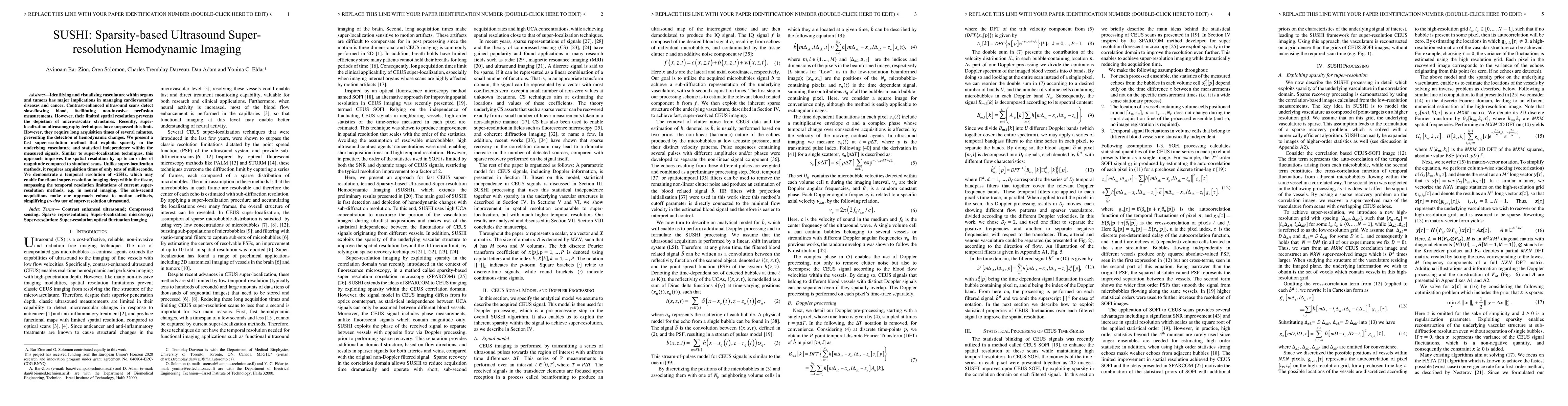 SUSHI presents a fast super-resolution method for ultrasound imaging that leverages sparsity in vasculature to enhance spatial resolution by an order of magnitude, while maintaining acquisition times of only tens of milliseconds, enabling robust in-vivo imaging and surpassing current temporal resolution limitations.