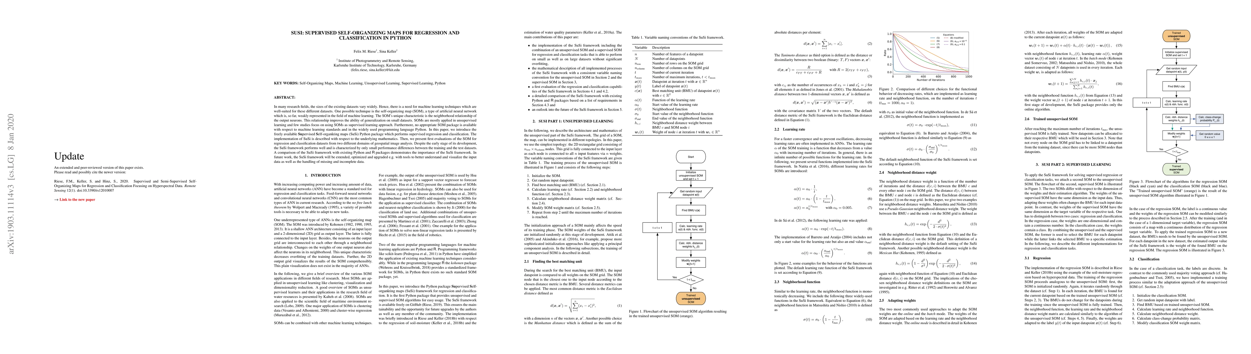 In many research fields, the sizes of the existing datasets vary widely. Hence, there is a need for machine learning techniques which are well-suited for these different datasets. One possible technique is the self-organizing map (SOM), a type of artificial neural network which is, so far, weakly represented in the field of machine learning. The SOM's unique characteristic is the neighborhood relationship of the output neurons. This relationship improves the ability of generalization on small datasets. SOMs are mostly applied in unsupervised learning and few studies focus on using SOMs as supervised learning approach. Furthermore, no appropriate SOM package is available with respect to machine learning standards and in the widely used programming language Python. In this paper, we introduce the freely available Supervised Self-organizing maps (SuSi) Python package which performs supervised regression and classification. The implementation of SuSi is described with respect to the underlying mathematics. Then, we present first evaluations of the SOM for regression and classification datasets from two different domains of geospatial image analysis. Despite the early stage of its development, the SuSi framework performs well and is characterized by only small performance differences between the training and the test datasets. A comparison of the SuSi framework with existing Python and R packages demonstrates the importance of the SuSi framework. In future work, the SuSi framework will be extended, optimized and upgraded e.g. with tools to better understand and visualize the input data as well as the handling of missing and incomplete data.