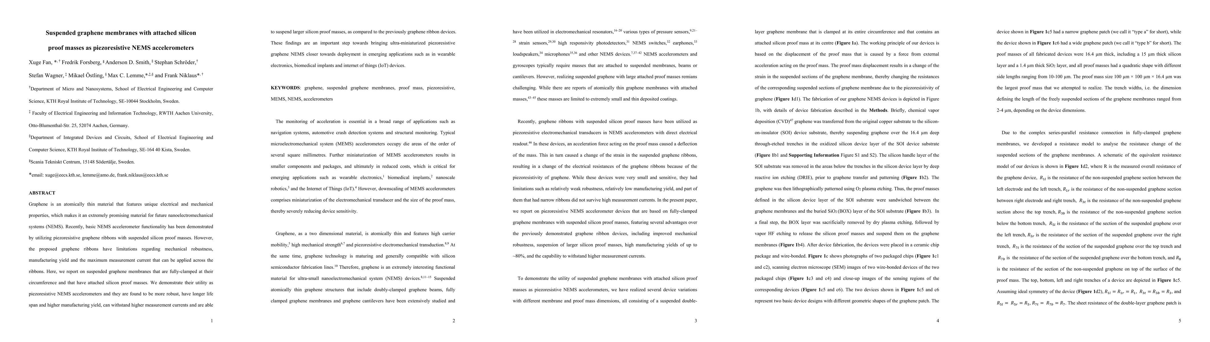 This research develops suspended graphene membranes with attached silicon proof masses for piezoresistive NEMS accelerometers, showing enhanced robustness, longer lifespan, higher manufacturing yield, and the ability to handle larger proof masses and higher measurement currents compared to previous graphene ribbon designs. This advancement moves ultra-miniaturized graphene NEMS closer to practical applications in wearable electronics, biomedical implants, and IoT devices.