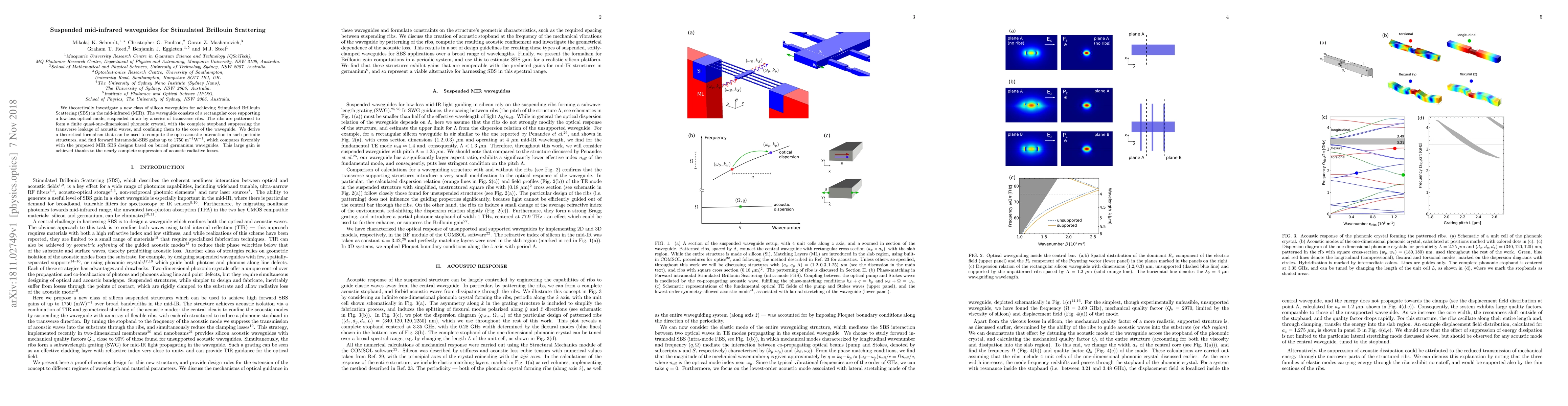 We theoretically investigate a new class of silicon waveguides for achieving Stimulated Brillouin Scattering (SBS) in the mid-infrared (MIR). The waveguide consists of a rectangular core supporting a low-loss optical mode, suspended in air by a series of transverse ribs. The ribs are patterned to form a finite quasi-one-dimensional phononic crystal, with the complete stopband suppressing the transverse leakage of acoustic waves, and confining them to the core of the waveguide. We derive a theoretical formalism that can be used to compute the opto-acoustic interaction in such periodic structures, and find forward intramodal-SBS gains up to $1750~\text{m}^{-1}\text{W}^{-1}$, which compares favorably with the proposed MIR SBS designs based on buried germanium waveguides. This large gain is achieved thanks to the nearly complete suppression of acoustic radiative losses.