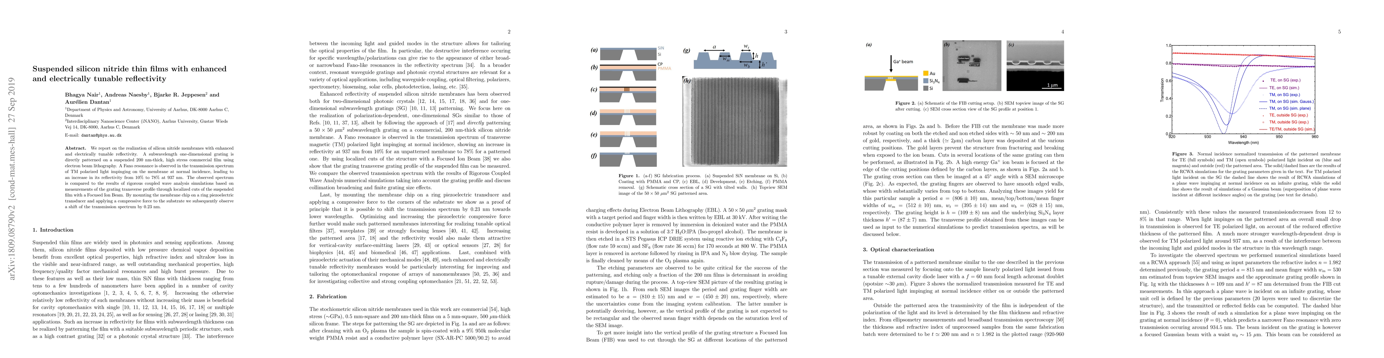 We report on the realization of silicon nitride membranes with enhanced and electrically tunable reflectivity. A subwavelength one-dimensional grating is directly patterned on a suspended 200 nm-thick, high stress commercial film using electron beam lithography. A Fano resonance is observed in the transmission spectrum of TM polarized light impinging on the membrane at normal incidence, leading to an increase in its reflectivity from 10% to 78% at 937 nm. The observed spectrum is compared to the results of rigorous coupled wave analysis simulations based on measurements of the grating transverse profile through localized cuts of the suspended film with a Focused Ion Beam. By mounting the membrane chip on a ring piezoelectric transducer and applying a compressive force to the substrate we subsequently observe a shift of the transmission spectrum by 0.23 nm.